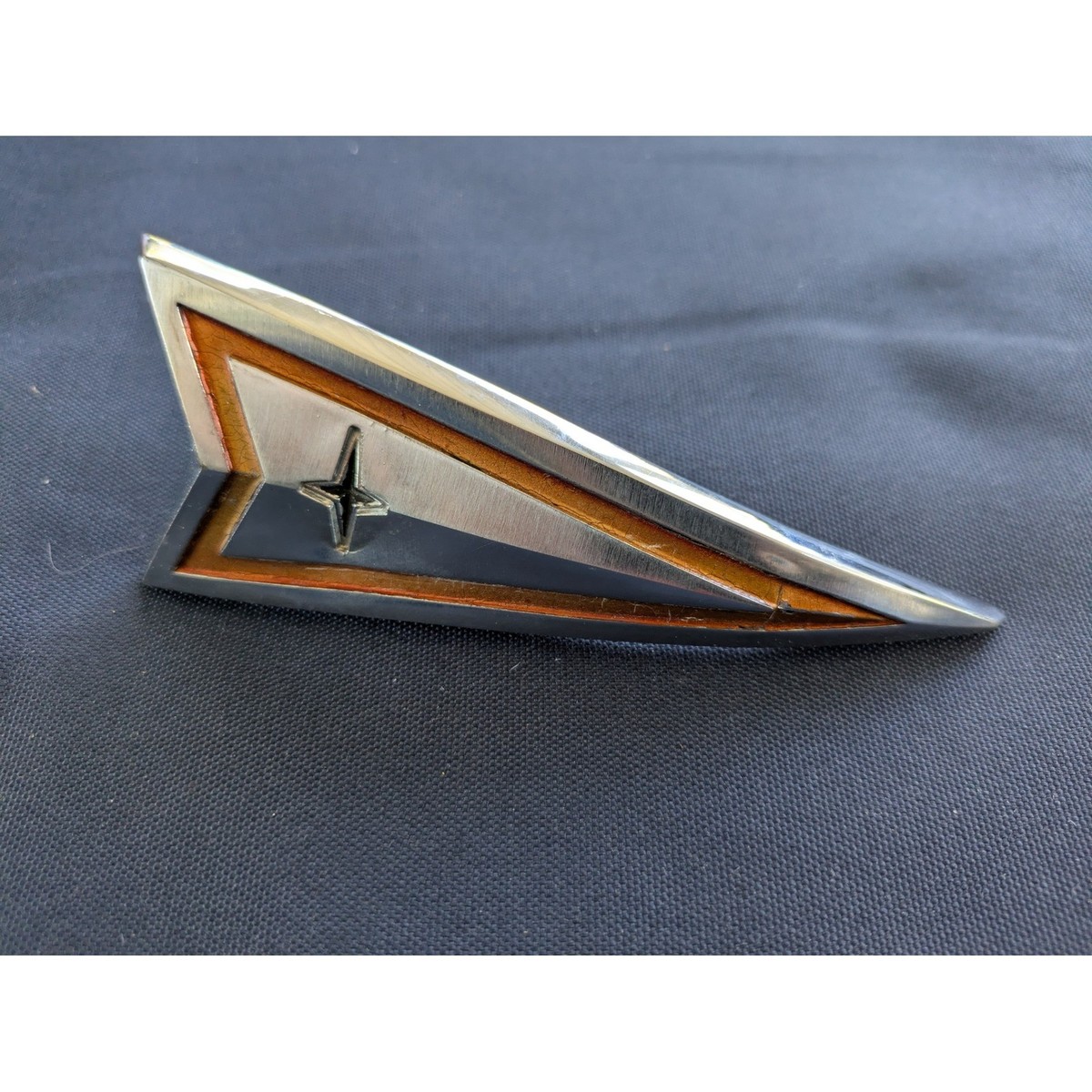 Own a piece of automotive history with this striking vintage car emblem. Its sleek, triangular silhouette, crafted with a gleaming chrome finish and accented by warm brown detailing, commands attention. At its heart, a stylized star emblem adds a touch of celestial flair, promising to elevate any vehicle's aesthetic. The robust construction and intricate design speak to a bygone era of automotive artistry, making this emblem a standout accessory for car shows, retro restorations, or adding a distinctive custom touch to your ride.