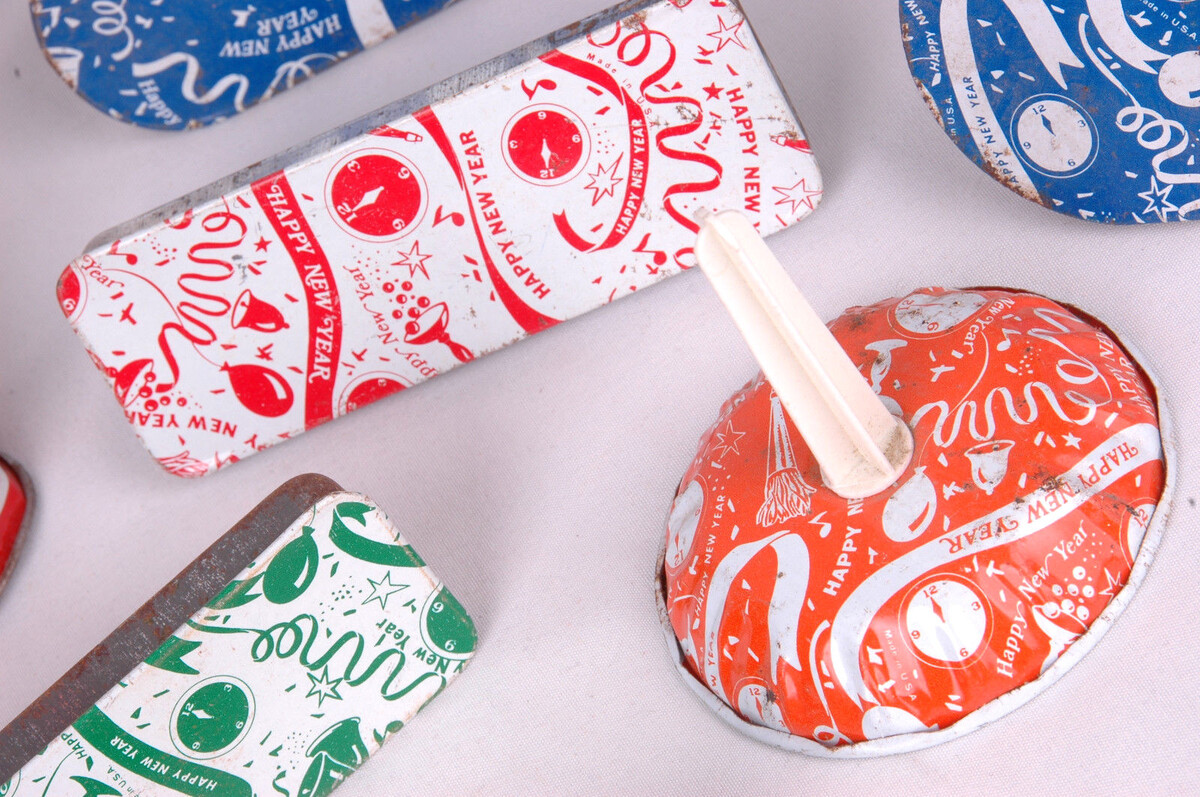 Vintage Lot of 11 Tin Metal Noisemakers-Happy New Year-Clown Circus-Made in USA