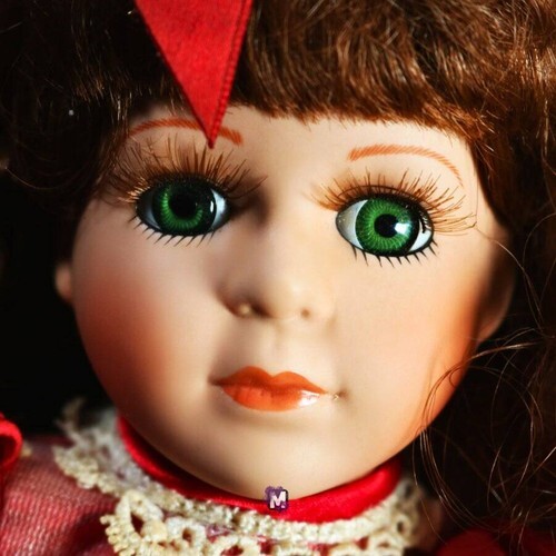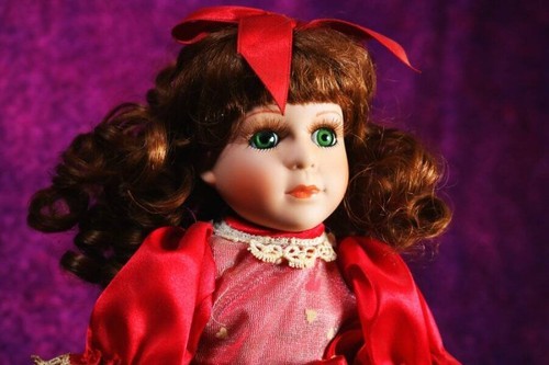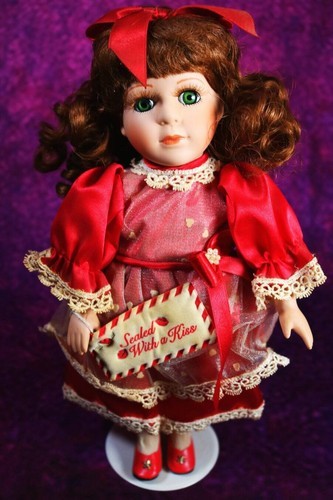 You will be receiving a beautiful porcelain doll. Tyriphe is around 11-12 inches tall. Her body is stuffed and her head, neck, arms, and legs are made of porcelain. She has long, curly brown hair topped with a bow and lovely green eyes. She is wearing a red and white-frilled dress. She has slightly yellowed due to age, but otherwise she is in perfect condition.