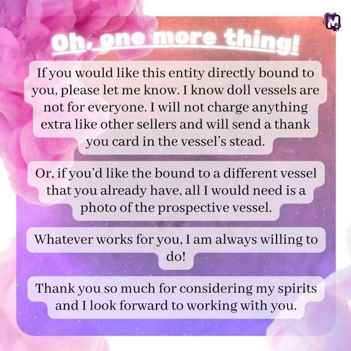 If you would like this vessel BOUND to you before arrival, please send your name and birthdate in a message. Being bound with a spirit will allow you to have a closer relationship and will increase their activity! This is something I offer free of charge, and I highly recommend the process!
