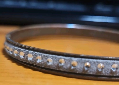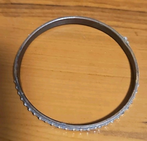 Add some vintage charm to your jewelry collection with this beautiful beige brass bracelet featuring felt and faux diamonds. This bangle style bracelet is perfect for adding a touch of elegance to any outfit. The bracelet measures 2 1/2 inches and is in great shape, with only three missing diamonds. The perfect addition to any jewelry collection, this bracelet is sure to impress. Missing 3 stones