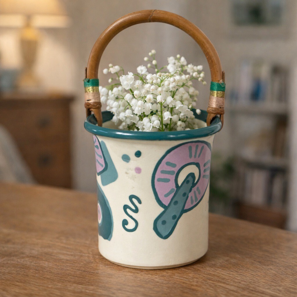 Vintage studio pottery bucket-style vase signed Keota and dated 1987. This handcrafted ceramic piece features a whimsical hand-painted design in teal, mauve, and cream tones, paired with a curved bamboo handle wrapped with decorative thread accents. A distinctive art pottery piece that works beautifully as a small vase, utensil holder, or decorative accent.