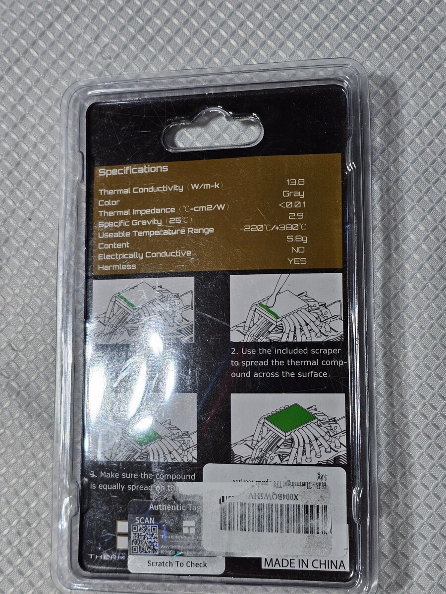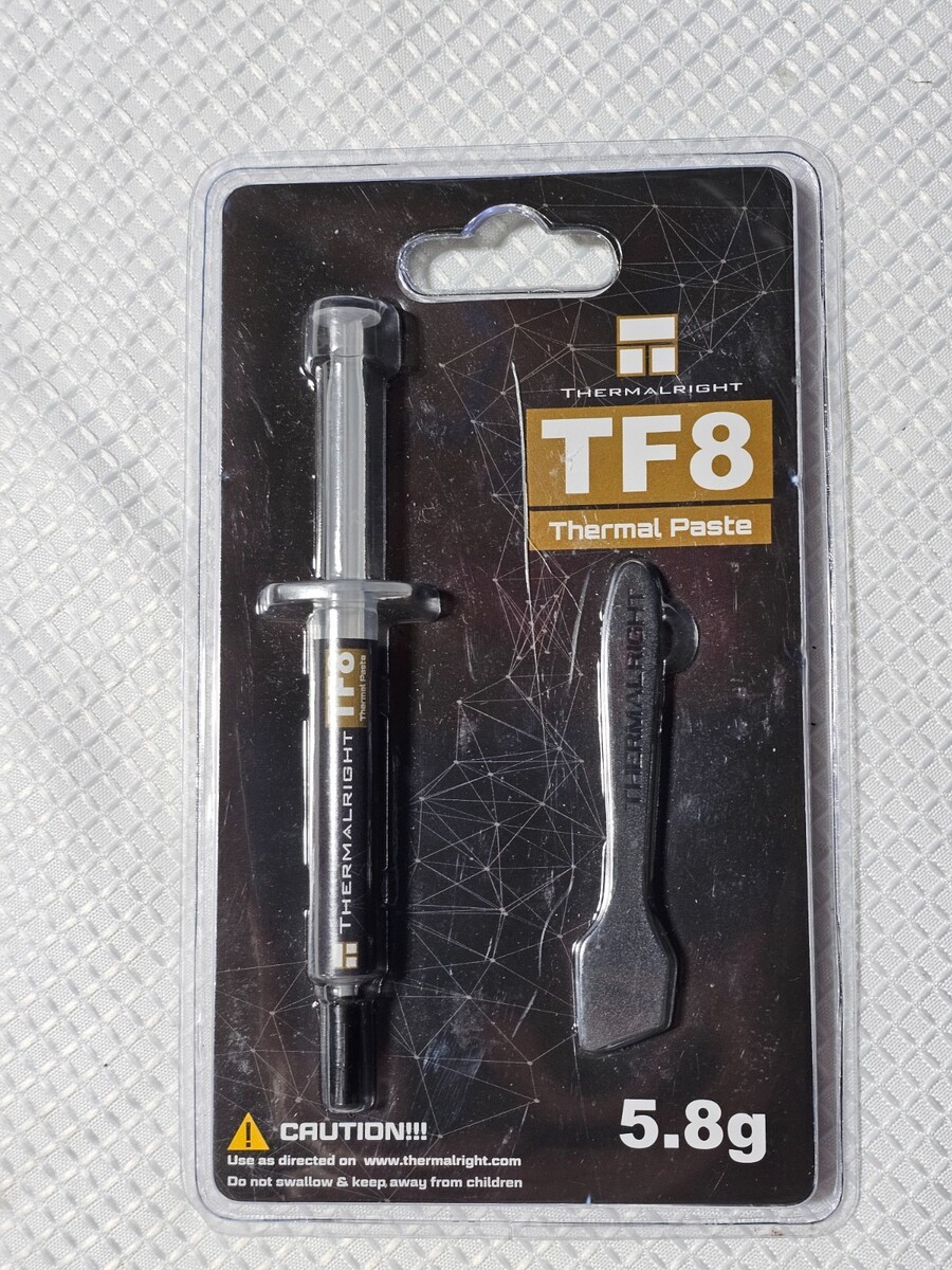 Description of item: Thermalright TF8 high-performance thermal paste delivers excellent heat transfer for CPUs and GPUs, featuring a thermal conductivity of 13.8 W/mยทK to help reduce operating temperatures and improve system stability. This 5.8g syringe includes an application spatula for easy, even spreading and is suitable for a wide temperature range from -220C to 380C. Non-electrically conductive and safe to use, TF8 is ideal for PC builds, upgrades, or maintenance, ensuring efficient contact between processors and heatsinks. Item is new and sealed in original packaging as shown.
