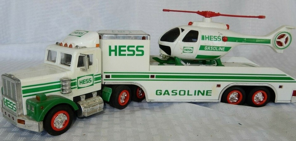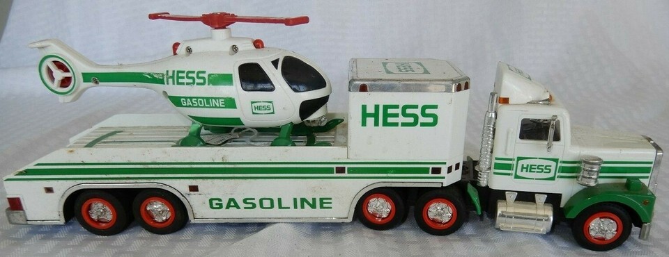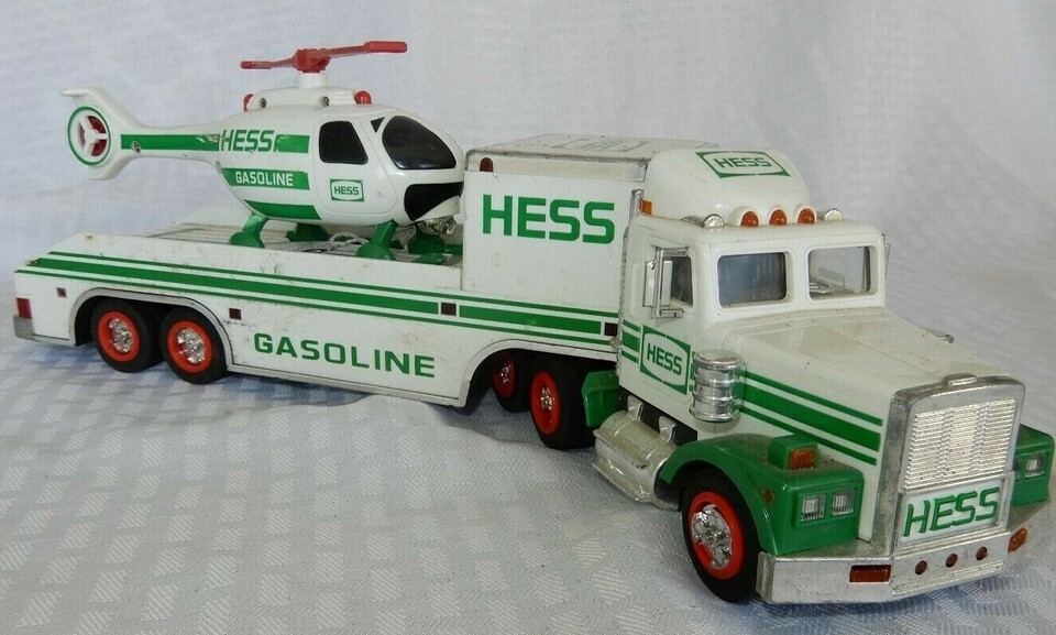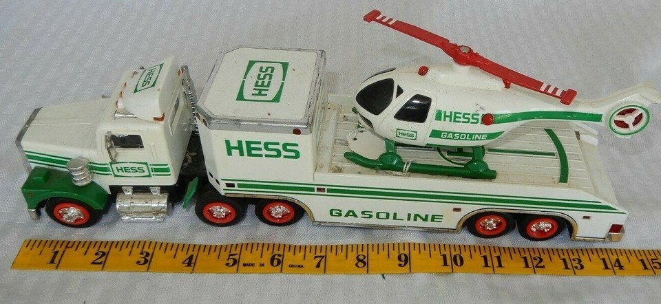Up for sale is a 1995 Hess truck with helicopter, in used condition not in box. This item is in good but used condition, there may be some scuffing on the paint, pictures are available to help you make a determination on condition. Item is untested and is sold as is. This is the perfect gift for someone looking to have a display not in box or a toy to play with as they were intended.