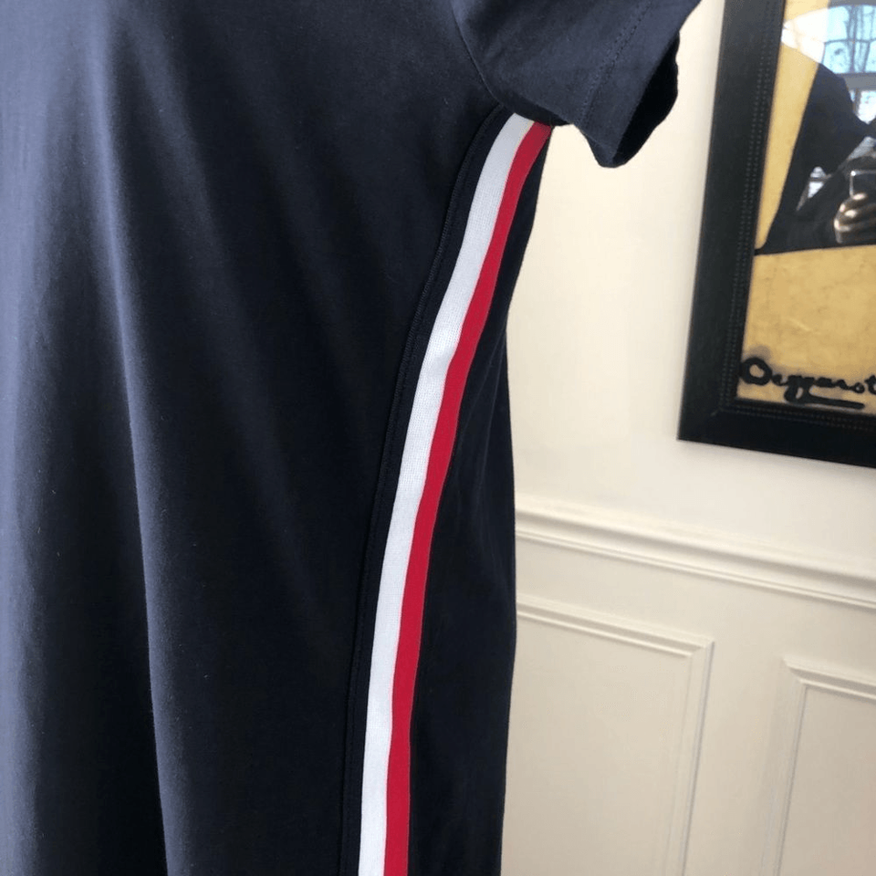 New without tags. Tommy Hilfiger T-shirt dress in Sky captain- navy blue with red and white striping down each side and white embroidered ?Tommy? across the chest. Short sleeve and crew neck. Measures approximately 35 inches from shoulder to hem and 18 inches from armpit to armpit
