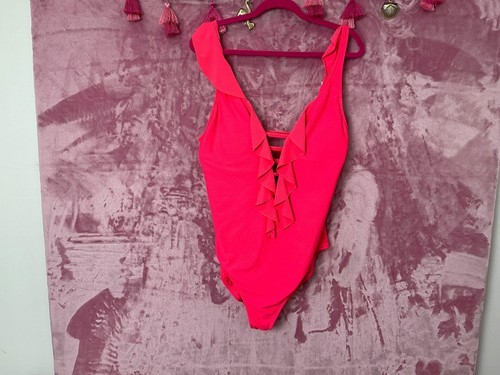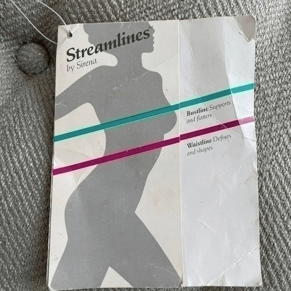 80s Sirena swimsuit new with tags still attached. Even though it is new and still has the tags there are a couple of scratches in the fabric, one on the turquoise waistband and just below that on the purple. These are scratches and do not go all the way through the fabric so they are not holes. know this is a swimsuit but I still feel like it could use some legwarmers and a sweat band, a la Olivia Newton-John or Jane Fonda. This one piece swimsuit has a blouson top, a turquoise gathered band across the waist and, according to the tag it is designed to ?shape and flatter your body?. Of course it is swimsuit material so it is very stretchy, but laying flat it measures 32 inches end to end, 18.5 inches armpit to armpit and 13 inches across the waist. Tag size 14 But I would say it?s closer to a modern size large