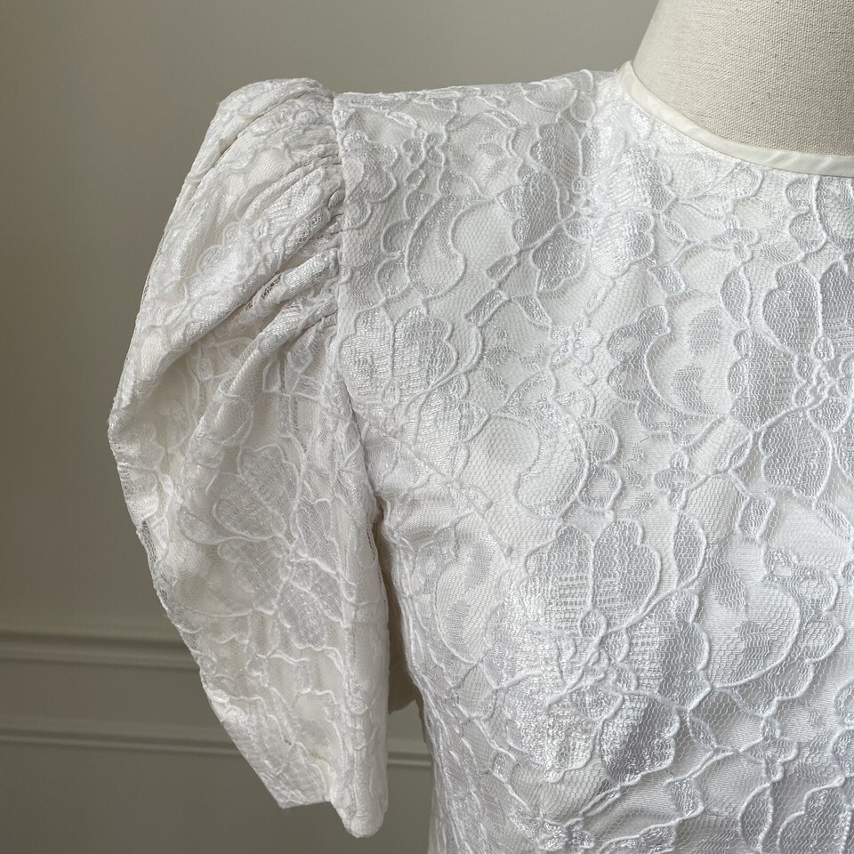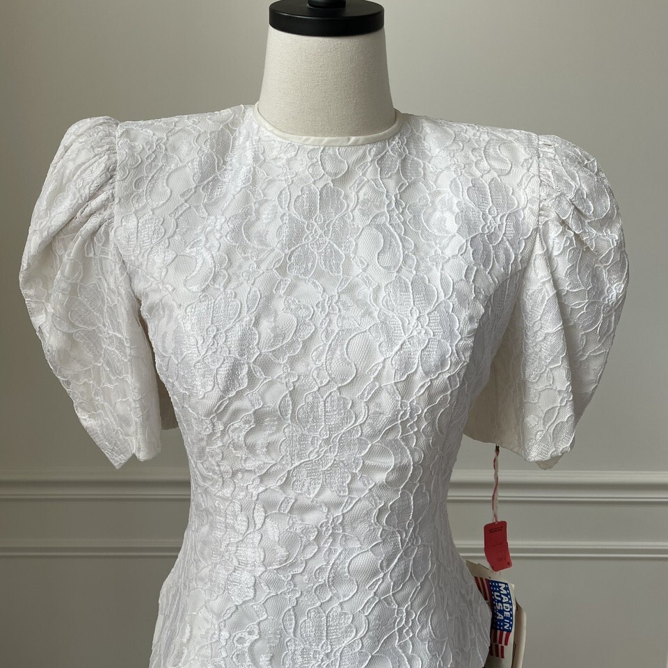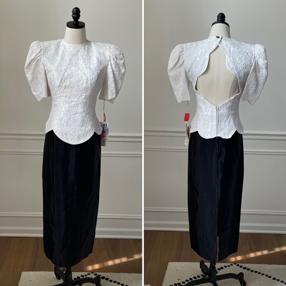 Ah, the 80s. New with tags still and never worn, this dress looks like it could?ve come straight from Crystal Carrington?s closet or maybe even Alexis?s? two tone, black and white midi length dress with 80s dramatic shoulder and pouf sleeve, and open back. the top half of this dress has a lace overlay and round neckline with slight Peplum at the waist. The skirt is solid, black acetate, and pencil style midi length. the back is open, zipping at the bottom, and there is a single button and snap closure at the back neck. That single button could stand to be secured a little better, but as of right now, it is functional and decorative. The brand is Susan Roselli for Vijack. And the tag size is 7/8 and there is a tri color ILGWU tag. Made in the USA. Laying flat measures 48 inches shoulder to hem, 14.5 inches straight across the waist and 17 inches armpit to armpit. Please note these measurements are closer to a modern size 6, so I am going to list it as such to attract the correct audience. Please double check measurements to ensure the proper fit for you.