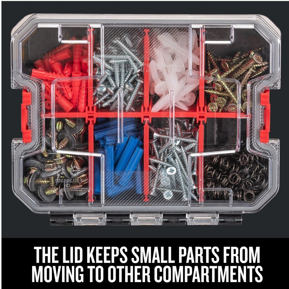 The Craftsman Versastack 8-compartment organizer with removable dividers is an optimal solution for hand tools and small parts. It has a durable polycarbonate lid that keeps contents in place and is compatible with Versastack system storage via the Versastack 20-compartment organizer or large and medium Craftsman organizers and toolsets. This organizer is also fully compatible with Tradestack system storage when connected via the Tradestack system adaptor.