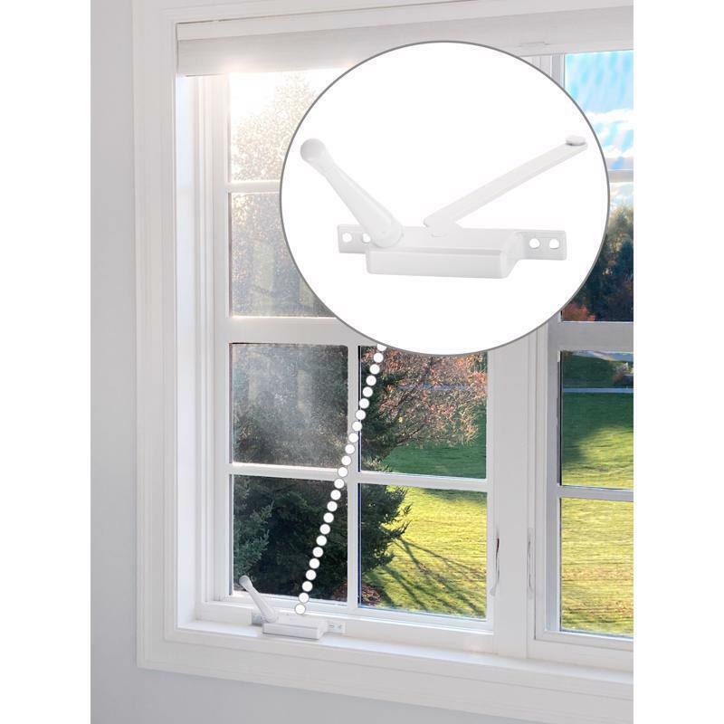 Left-handed white square body casement window operator with a 9 in. steel arm featuring a round disc on the tip (some older styles had a small wheel instead). The worm gear is driven by a 3/8-inch crank spindle. Includes matching crank handle and installation screws. Mounting holes are available at 3-7/8 and 4-3/4 inches in center.