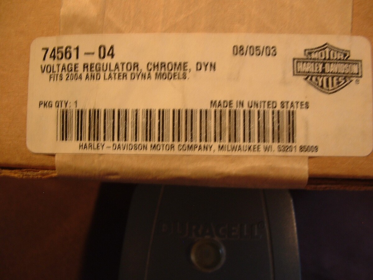 Harley Davidson CHROME voltage regulator. Part number 74561-04. Fits 2004 and up DYNA models. How far up in model years this will fit I do not know. That info is best asked for at your dealer. This is a brand-new chrome part. Connector plugs are 2-blade and 3-pin as shown in the pictures. Check the part number and the pictures. Be sure this will work for you.