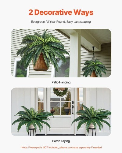 Hang or Lay Flat: This artificial Boston fern can be placed in a hanging basket, and its lightweight design avoids falling due to weight. Alternatively, place it in a pot and lay it flat on the ground to decorate your porch or room. Note: The pot is not included and must be purchased separately