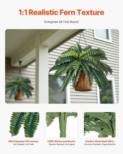 Realistic Texture: The leaves of these artificial ferns are crafted from PE and silk fabric, offering the soft, flexible texture of real plant leaves while resisting fading. The stems and roots are also weather-resistant and durable, retaining shape and lifelike quality