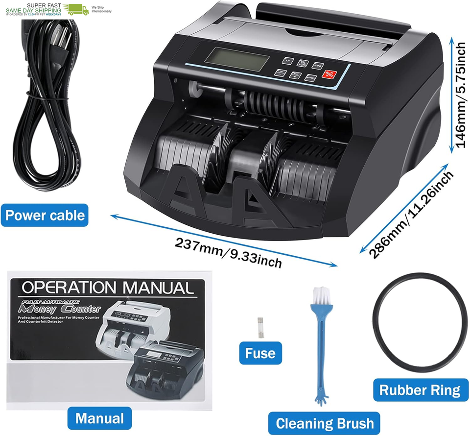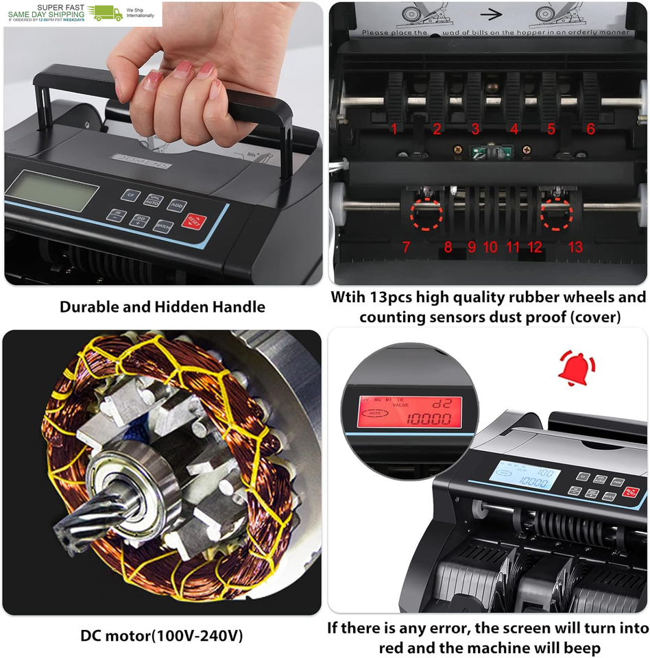 [Efficient and Accurate Counting: ]Money Counter with DC motor that can adapt to wide voltage from 85V-250V,to make sure the machine run stable . It can count more than 1100 bills/min smoothly, quickly and accurately.
