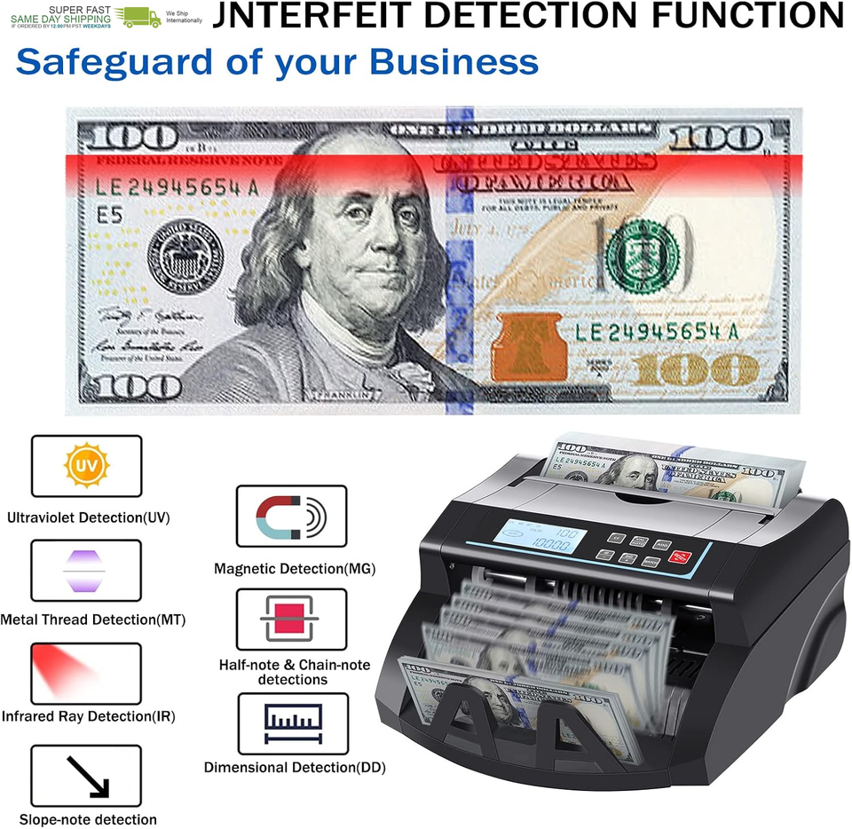 [Multi Anti-Counterfeit Detection:] This money counter machine has UV/MG/MT/IR/DD detecting technology to detect the false bills.