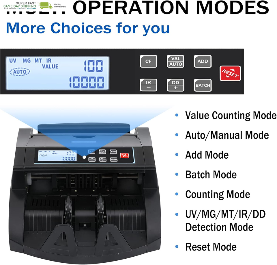 [Multiple Modes for Choice ] This bill counter has Value Counting,Auto/Manual,Add,Batch,Counting,Detection,Reset modes for optional. These modes can meet various cash counting demands.