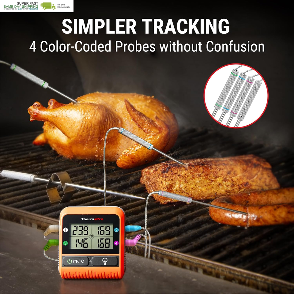 4 Color-Coded Probes for Simple Tracking: Monitor up to 4 different meats or temperatures at once with easy-to-identify, color-coded probes. No confusion, just straightforward, organized cooking, making this a wireless grill thermometer that empowers you to cook smarter, not harder