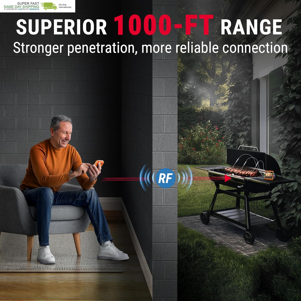 More Stable Than Bluetooth: Our advanced RF technology ensures a stronger, more reliable connection than Bluetooth. This smoker thermometer provides the freedom to move around without losing connection! Monitor your BBQ from up to 1,000 feet away!