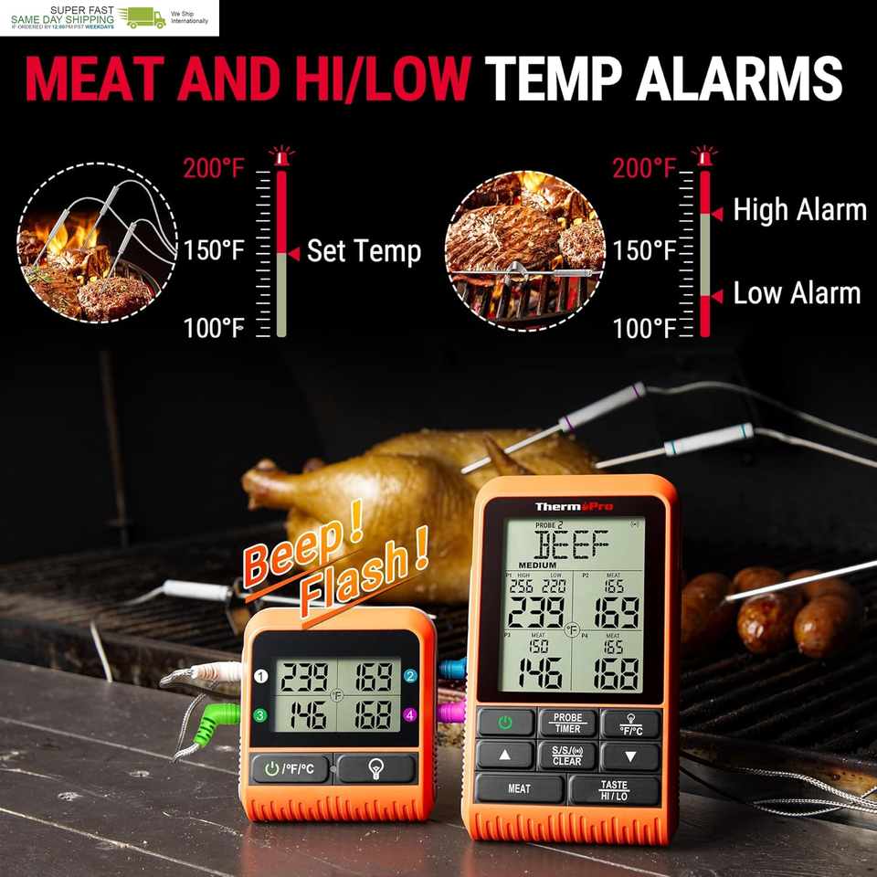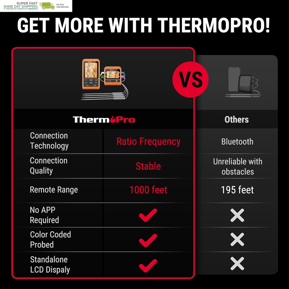 Thermopro meat thermometer for cooking is built with the strongest and most reliable RF technology, allowing you to monitor your food temperature from up to 1000FT away. Make outdoor cooking a breeze with any appliance.