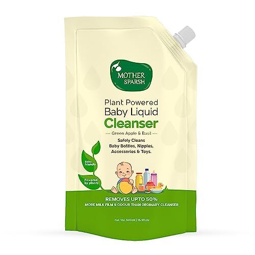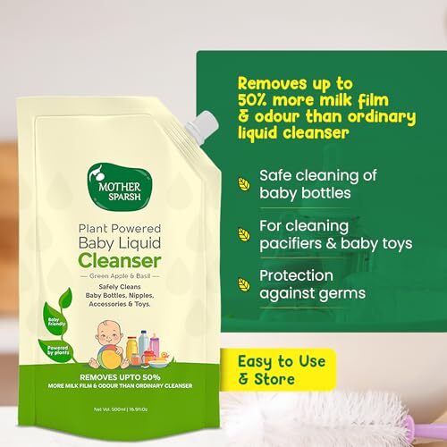 Bullet point: POWERED BY PLANTS- A baby's immune system is sensitive and prone to infections from external factors may be from the chemicals used in different baby products. Mother Sparsh Plant-Powered Bottle Liquid Cleanser is made with a blend of botanical extracts and plant-derived ingredients like Basil Green Apple that have a mild cleansing action on baby bottles which is safe for baby's health.