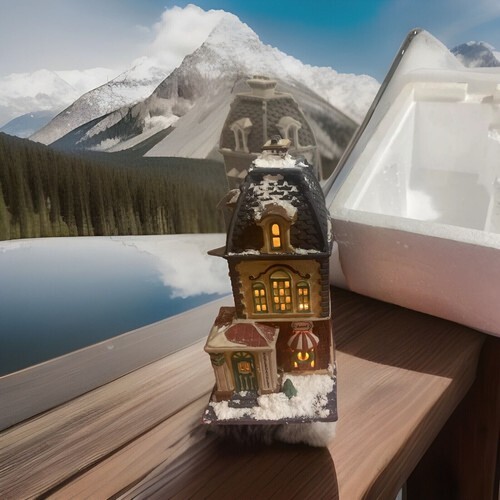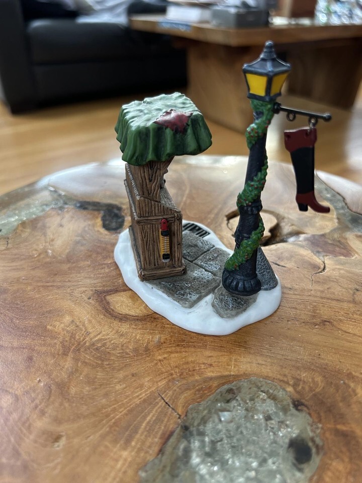 Includes detailed miniature shoes, a lamppost with hanging stocking, and a green awning.