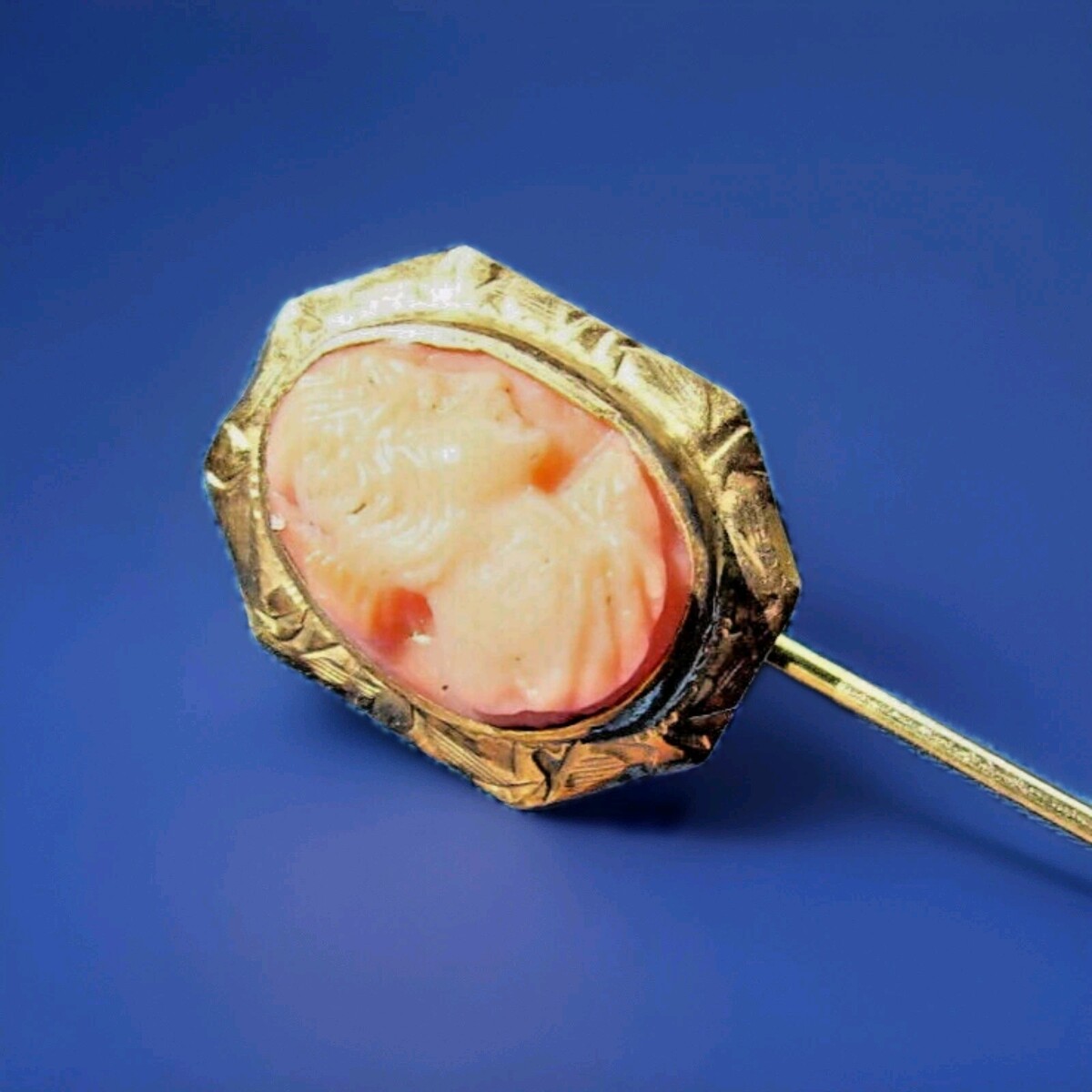 Art deco pin featuring beautiful European cut coral portrait set in solid gold.