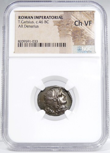 History: The mint college of 46 BC included three monyers: Manius Cordus Rufus, Titus Carisius, and Caius Considius Petus. Titus Carisius exalts Caesar's origins in his monetary iconography and participates in the celebration of Caesar's quadruple triumph that year. Vercingetorix, after participating in the Imperator's triumph, was strangled at the Mamertine. Little is known about Titus Carisius's career beyond his monetary triumvirate.