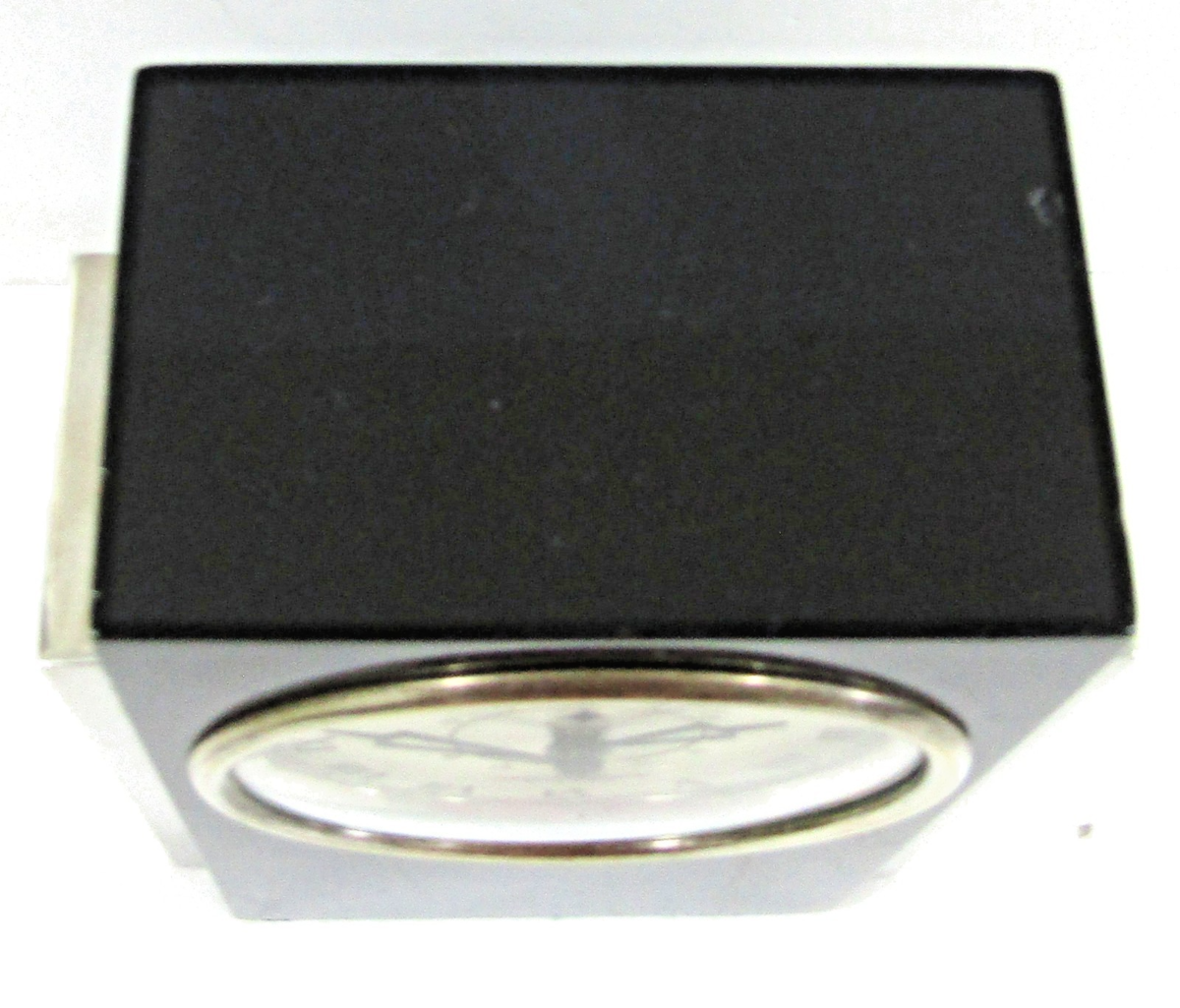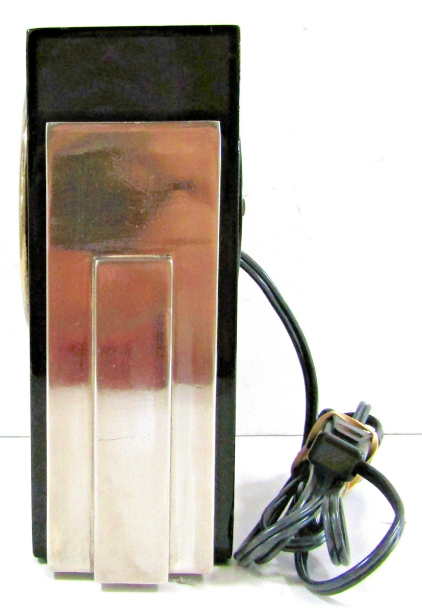The Hamilton Sangamo Synchronous 1930s Scarsdale Model Black Lacquer Chrome Clock is an antique clock from the early 20th century. It features a rectangular shape with a black and silver color scheme, displaying Roman numerals. This quartz plug-in electric clock by the Hamilton brand showcases a classic design with a wood frame, making it a decorative collectible for any room in your home. Made in the United States, this original clock captures the nostalgia and style of the 1930s era.