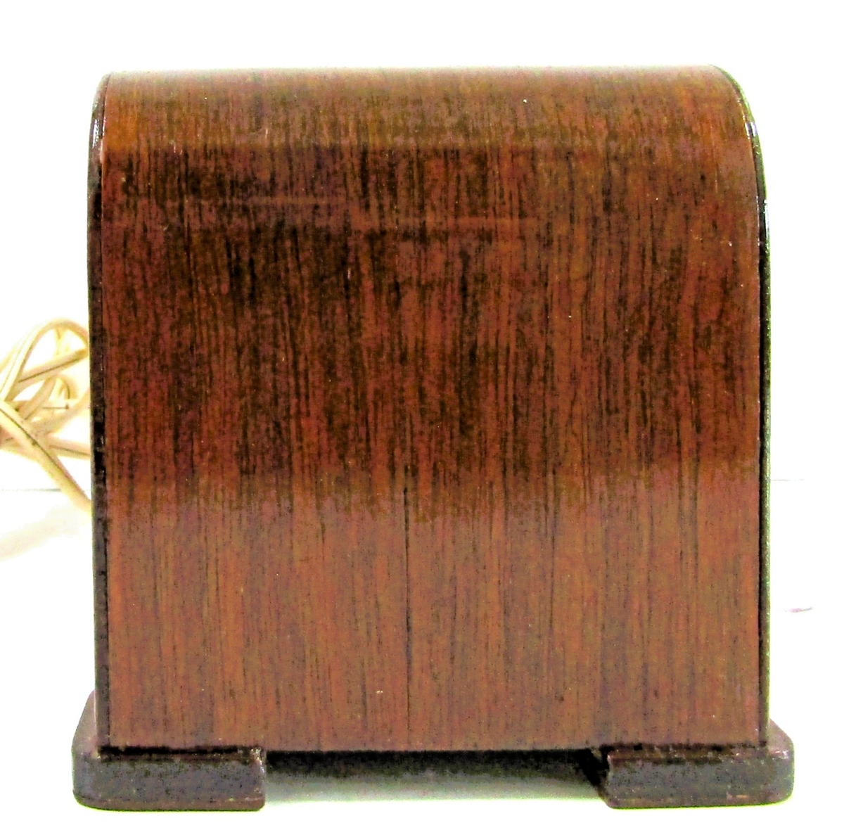 The clock keeps great time. The wood case has a slight crack in the veneer on the right side, the number display is clean with no damage.