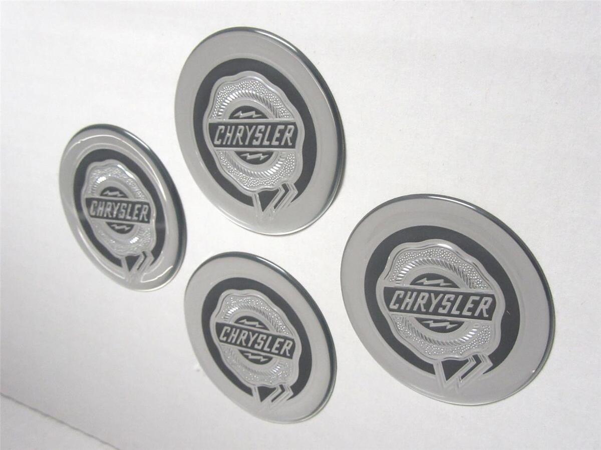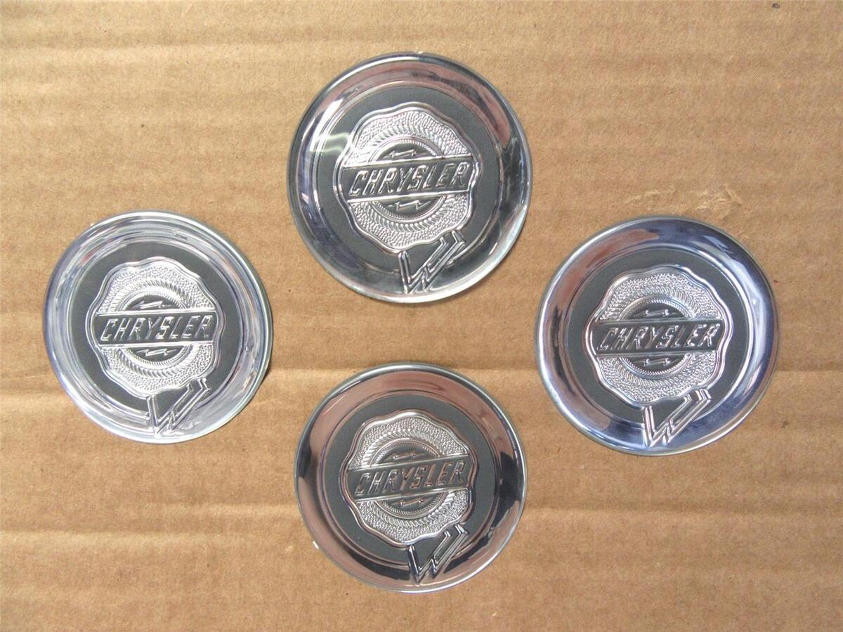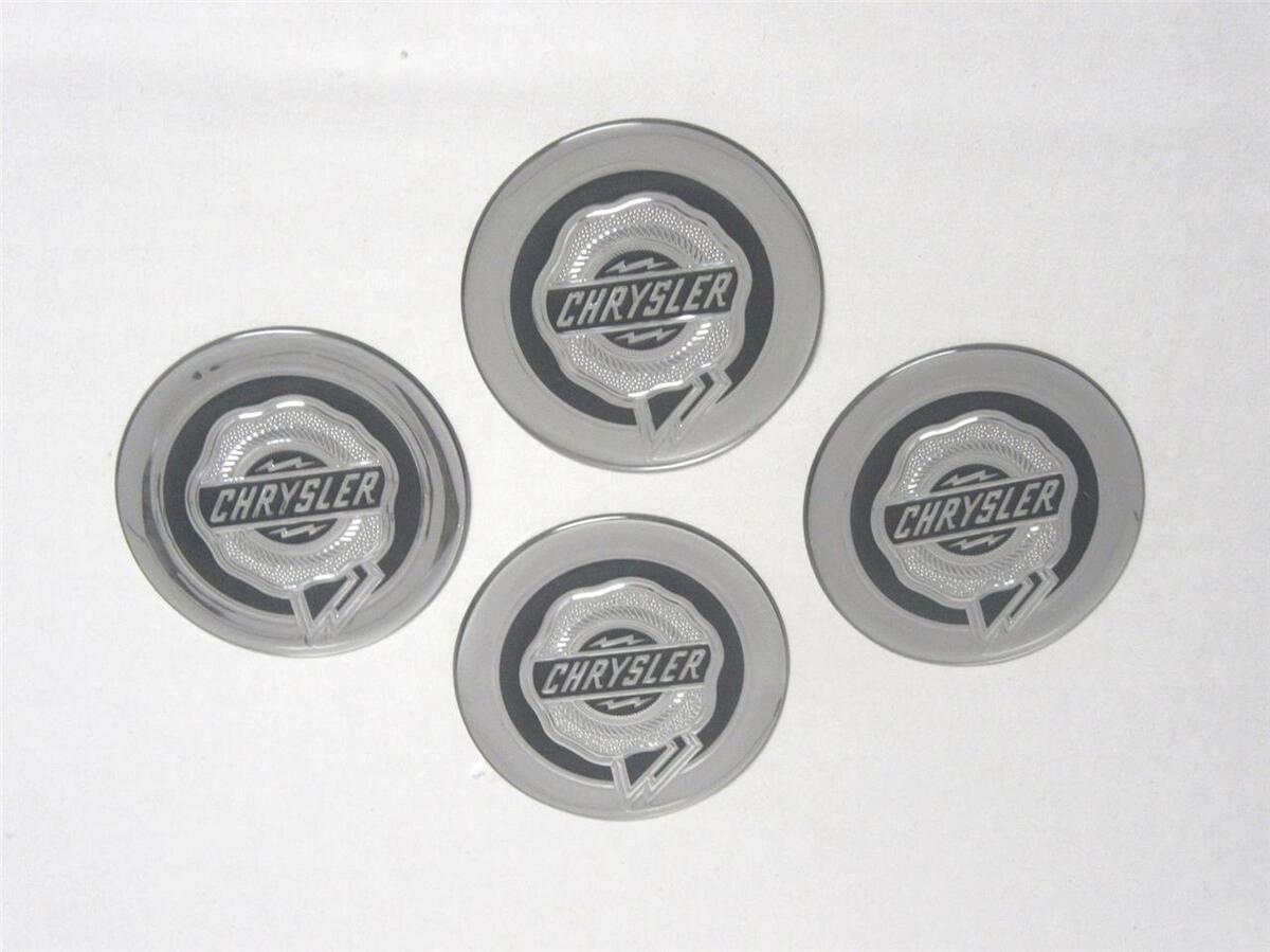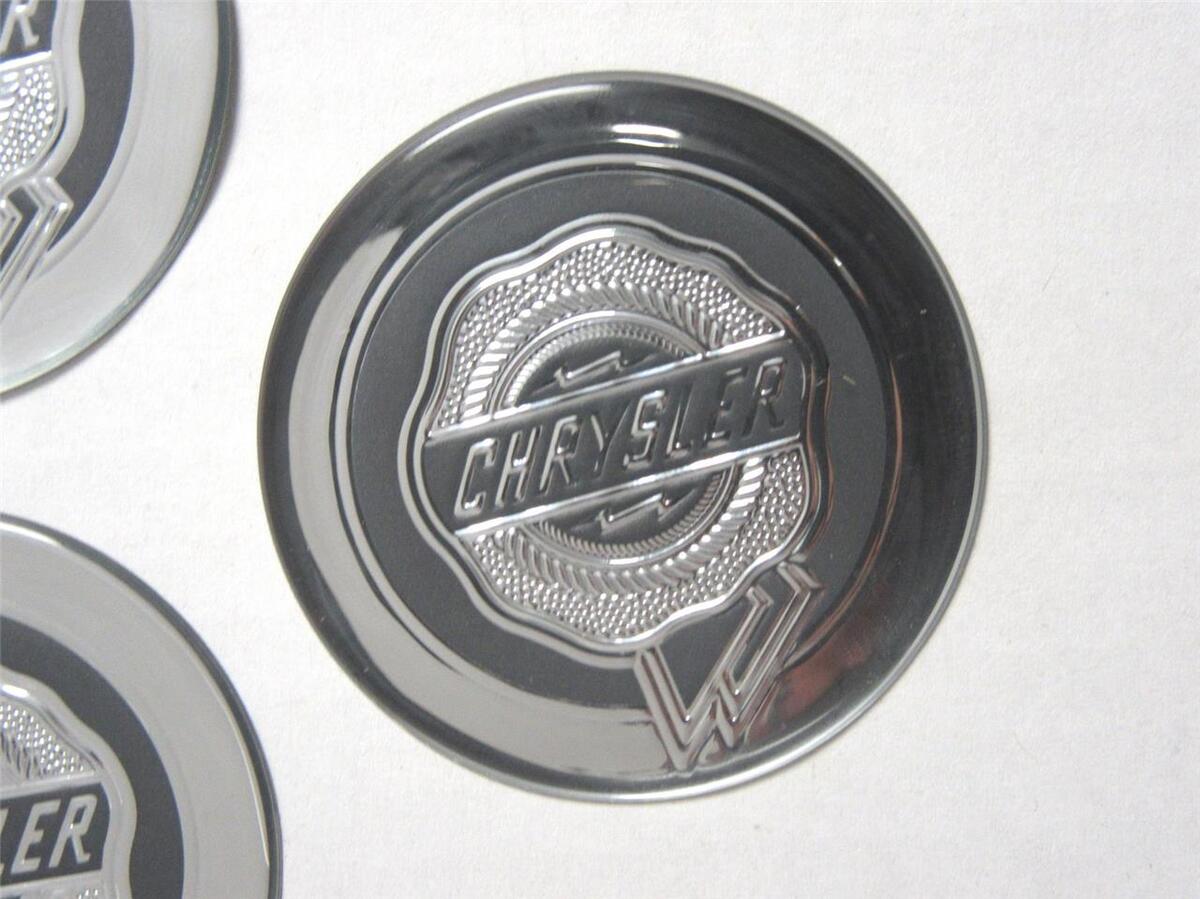 This ad is for a set of Four (4) Genuine For Chrysler Accessory wheel center caps Stick on Medallions. These have a reflective outside and gray accent.