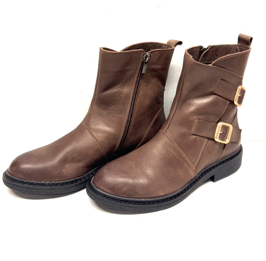 MIZ MOOZ LEATHER BOOTS SIDE ZIP / BUCKLE 37EU / 7US COFFEE Z-190