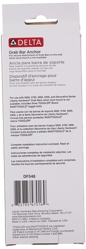 The Delta grab bar anchor for non-stud mount featuring the Snap Toggle by Toggler helps you install a grab or assist bar when you can only secure one end of the bar into a stud. The Delta grab bar anchor requires only a 1/2 inch diameter hole for installation and pre-installs without a bolt for easier installation. The snap toggle heavy-duty wall anchor used for the Delta grab bar anchor features a patented strap design that would not break prematurely, adjusts more precisely and will snap off flush against the wall.