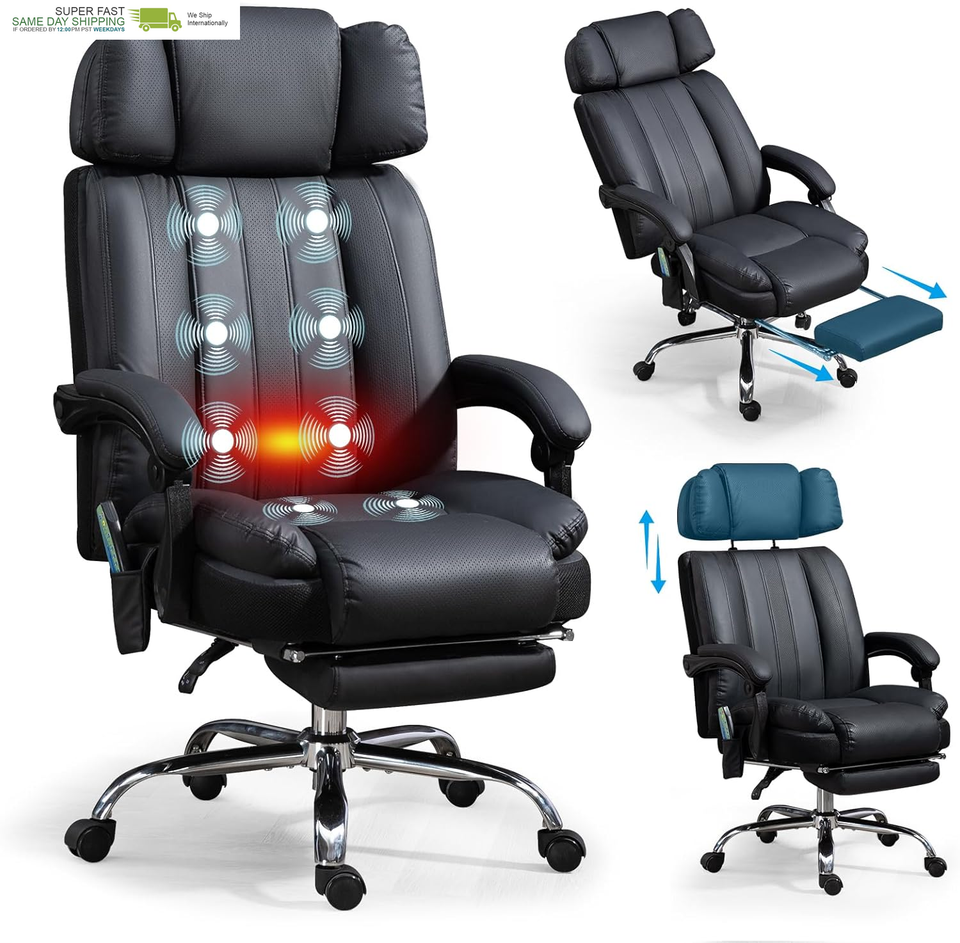 Massage Office Chair with Heat and 8 Vibration Points Big and Tall Executive Office Chair with Adjustable Headrest, Extra Wide Seat, Footrest, Padded Armrests, Reclining High Backrest