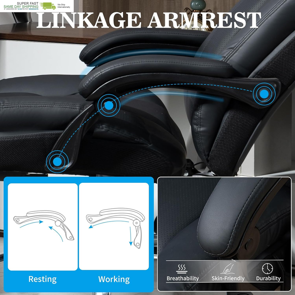 ?Fully Customizable Support?Our office chair features a reclining backrest (90-135), height adjustability, and a retractable footrest for the perfect sitting position. The chair also rotates 360, providing complete flexibility and freedom of movement.