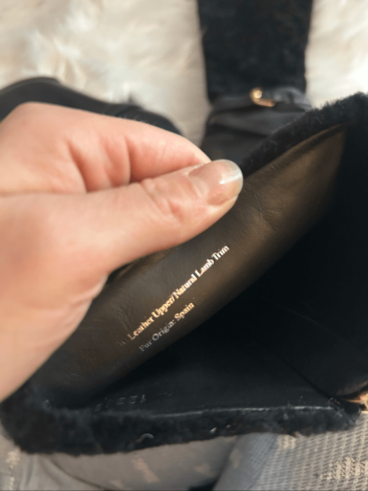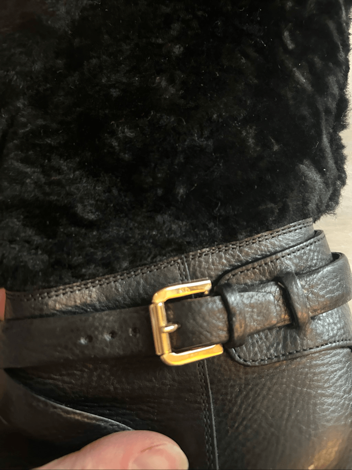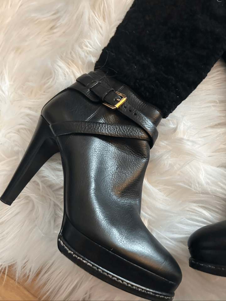 Ralph Lauren collection sz 38\8 lamb fur black leather w 4” heel made in Italy