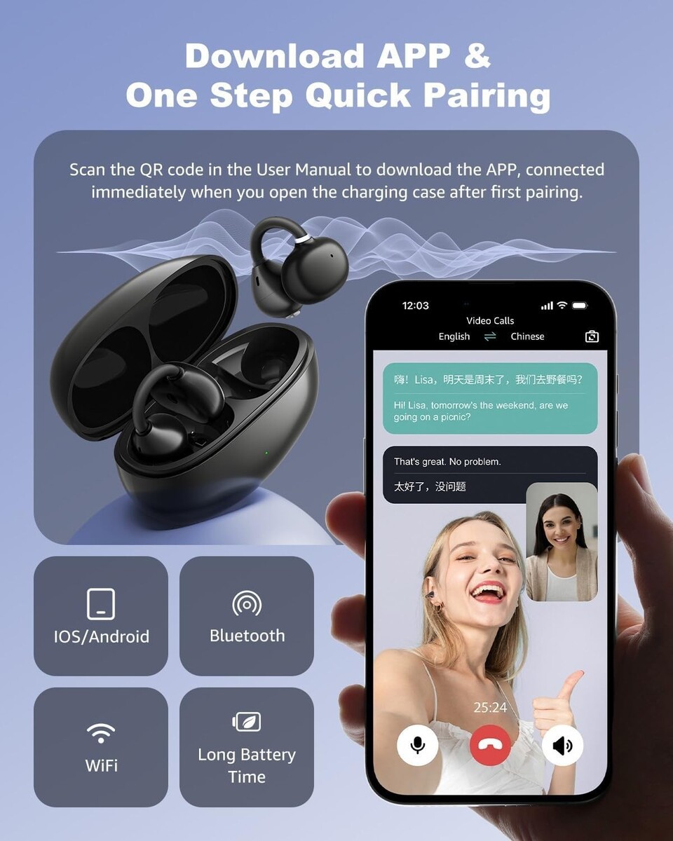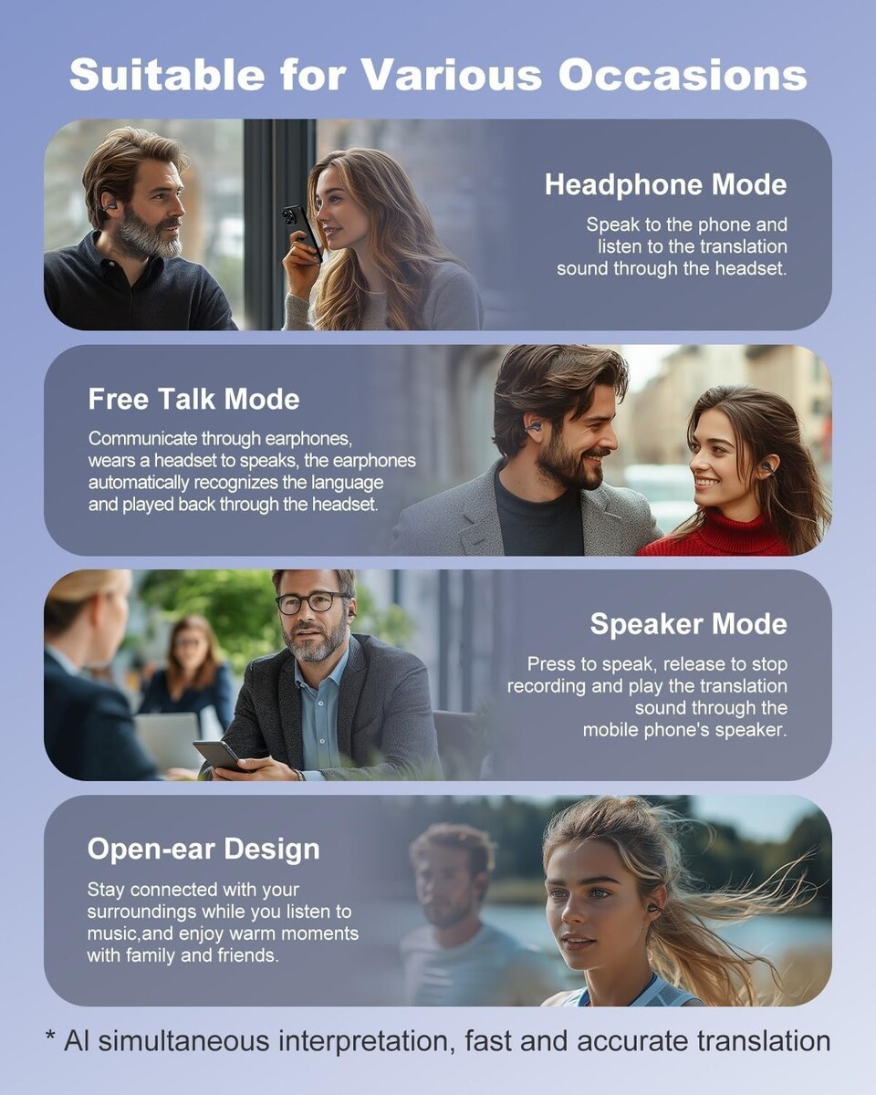 ?Multi-Scenario Translation Modes?Translator earbuds provides provides a variety of innovative translation modes, including free talk mode, headphones mode, speaker mode, audio transcription, photo translation and video call translation. Voice transcription function can automatically organize meeting content and quickly generate meeting minutes, as it greatly improves efficiency. Experience high-precision real-time translation languages, empowering you to converse naturally and confidently for travel, learning, or business communication.