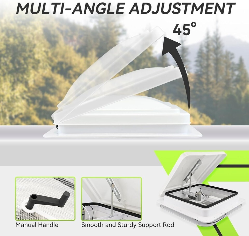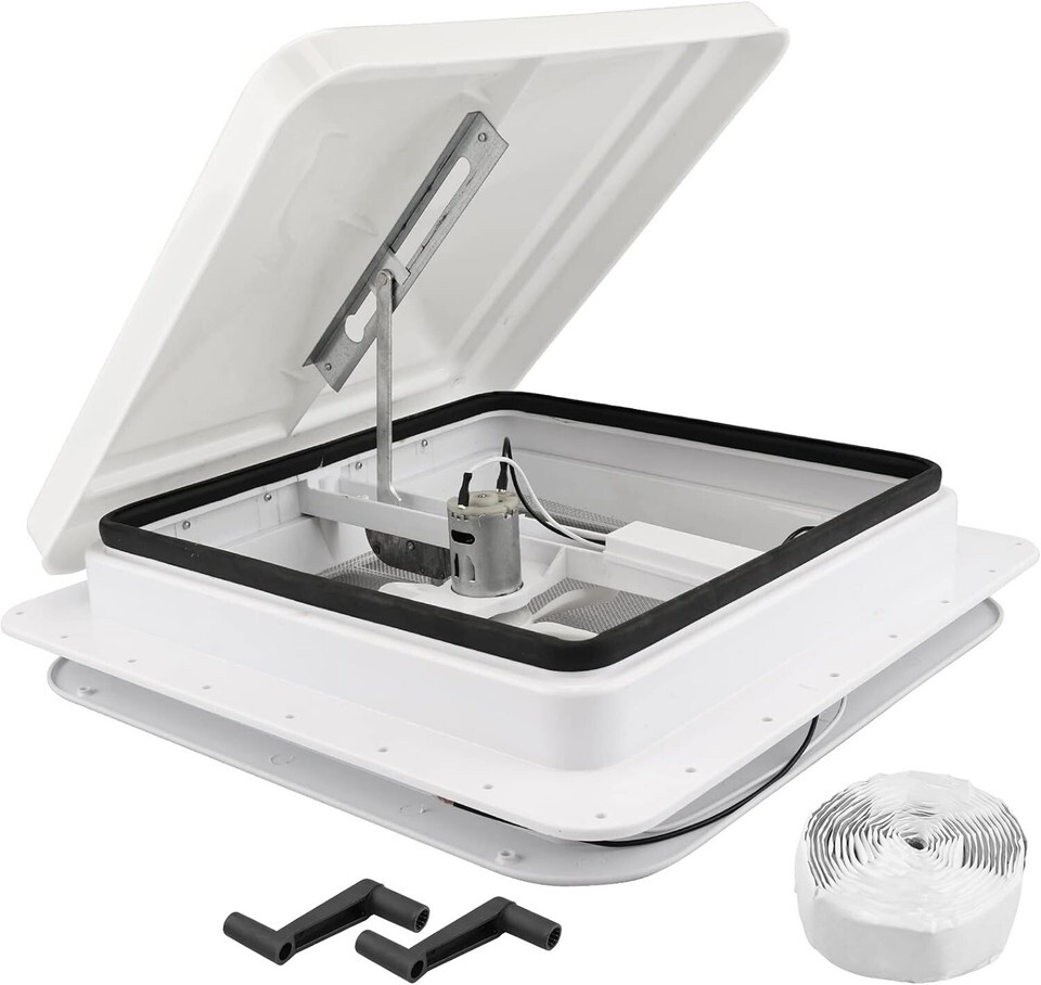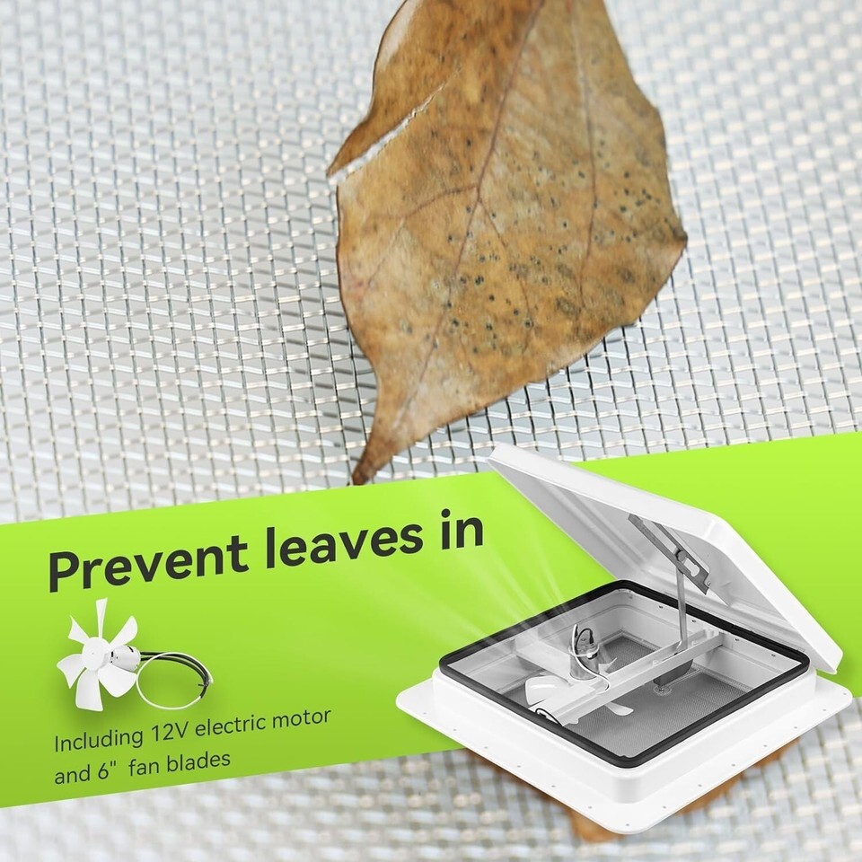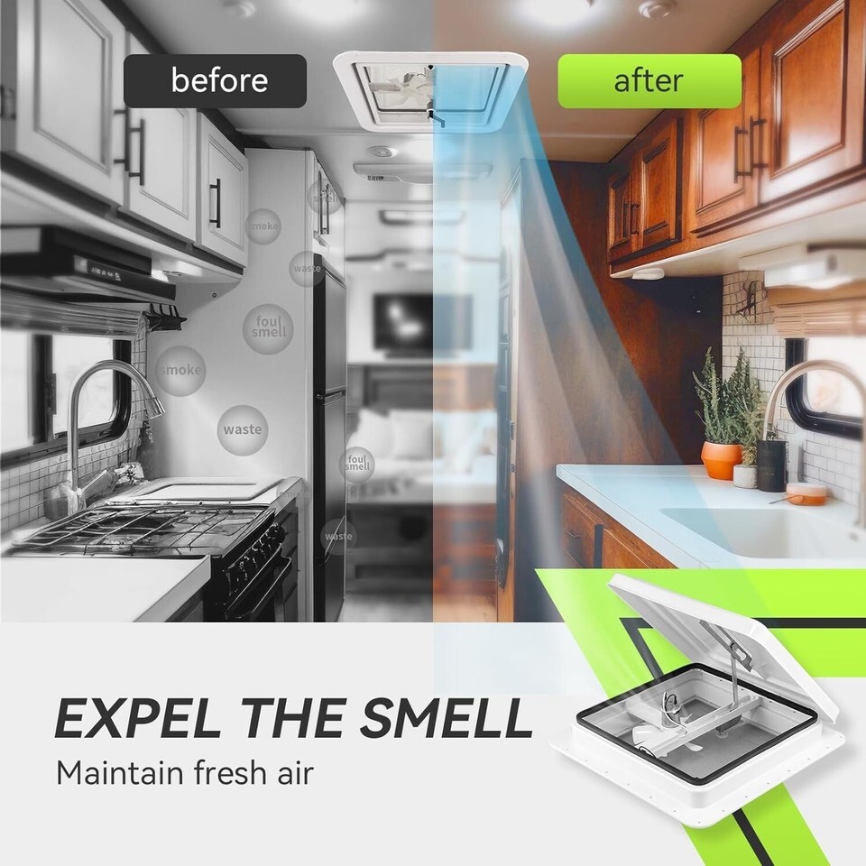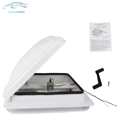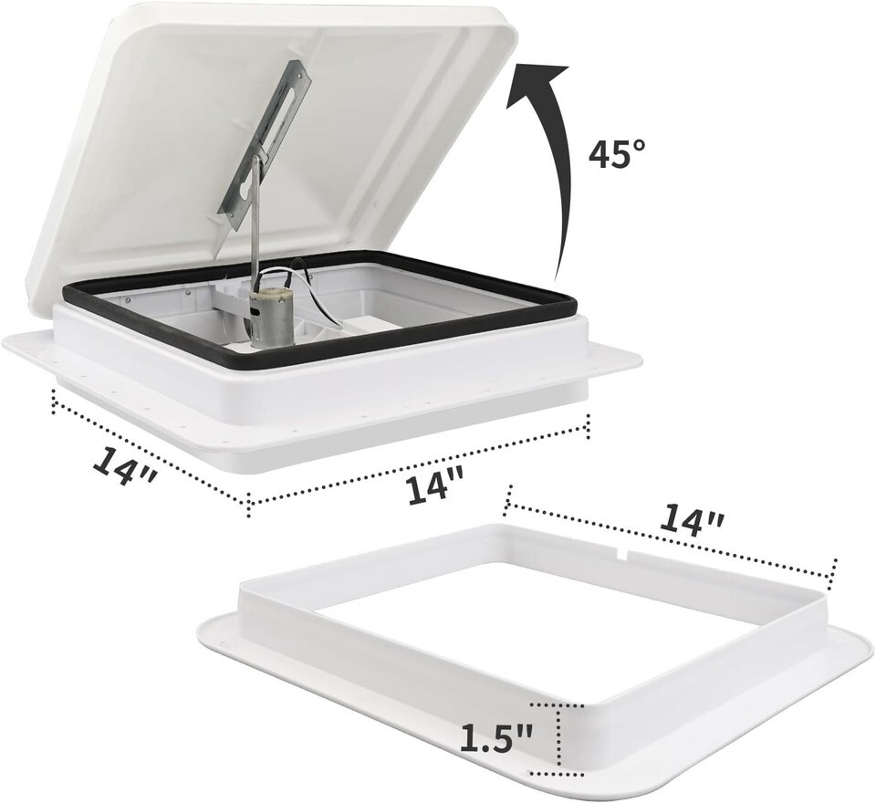 This RV roof vent fan provides a fantastic air circulation for RV, trailer, camper and other vehicles, and helps to lower indoor temperature eliminating smell from food, smoke, waste, pets, etc. It is a great choice to replace your old cracked roof vent whose size is 14" x 14".