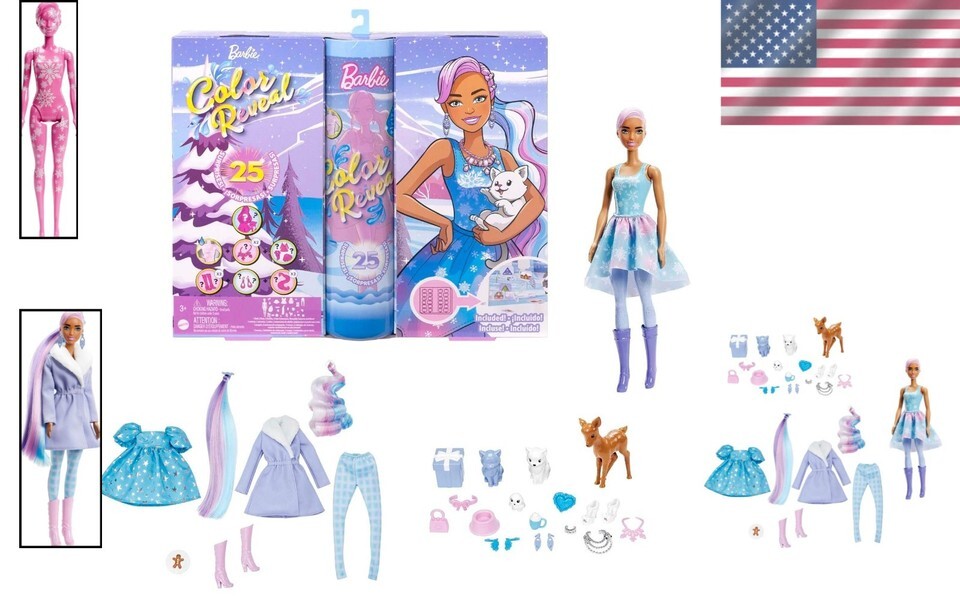 Set Includes: Doll,Barbie Color Reveal Doll,Color Reveal Kitten,Winter Deer,Snow Owl,Clothing Fashions,Fashion Accessories,Hair Extensions