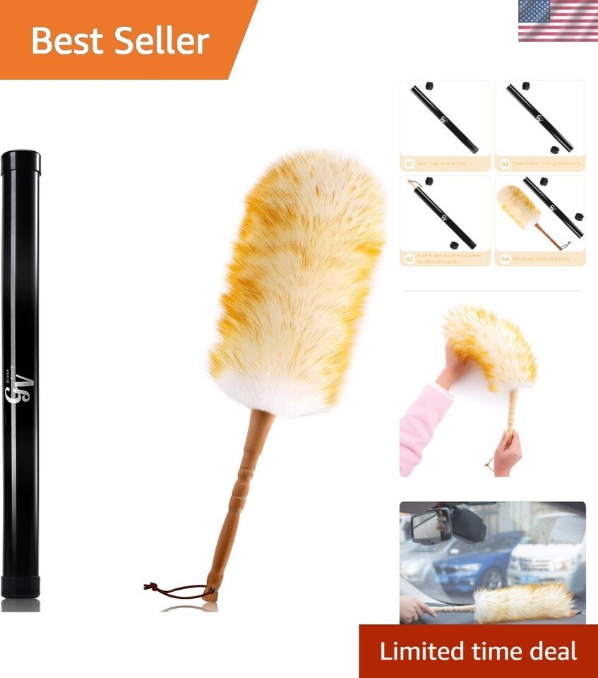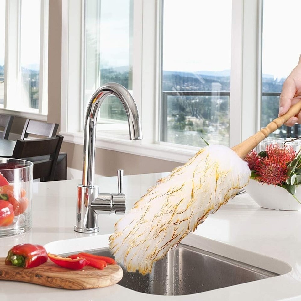 lambswool duster,made of 100% pure premium quality lambswool,anti-static,contains natural lanolin,which attracts and holds dust like a magnet,the soft texture will not stratch any surfaces;With solid wooden handle,durable for ?s a ideal cleaning solution for ceiling Fans, Window Blinds, Computer Screens, Keyboards, Plant Leaves, Dashboards, Bookshelves,Car Windows,Pets Hair,anywhere narrow or places hard to reach. Specification: Dimensions: ?x ? Head dimensions when fluffed: ?x ? OZ Material: Lambswool,solid wooden handle Color: Brown-white Cleaning Method: a twist after usage,then dust will fall; dirty?Ringe with warm clean water,temprature not exceed 86?;And dry by hanging in ventilation air,not exposed to the sun Notes: far away from fire pls; not expose it in the sun pls. Pls forgive us for plus and minus inch differences due to manual measurement.