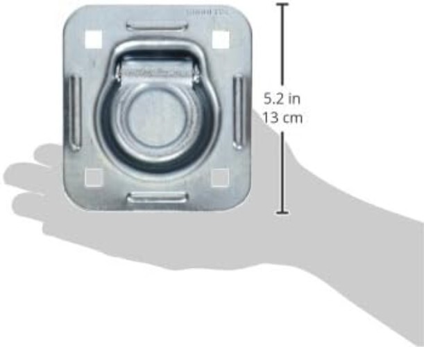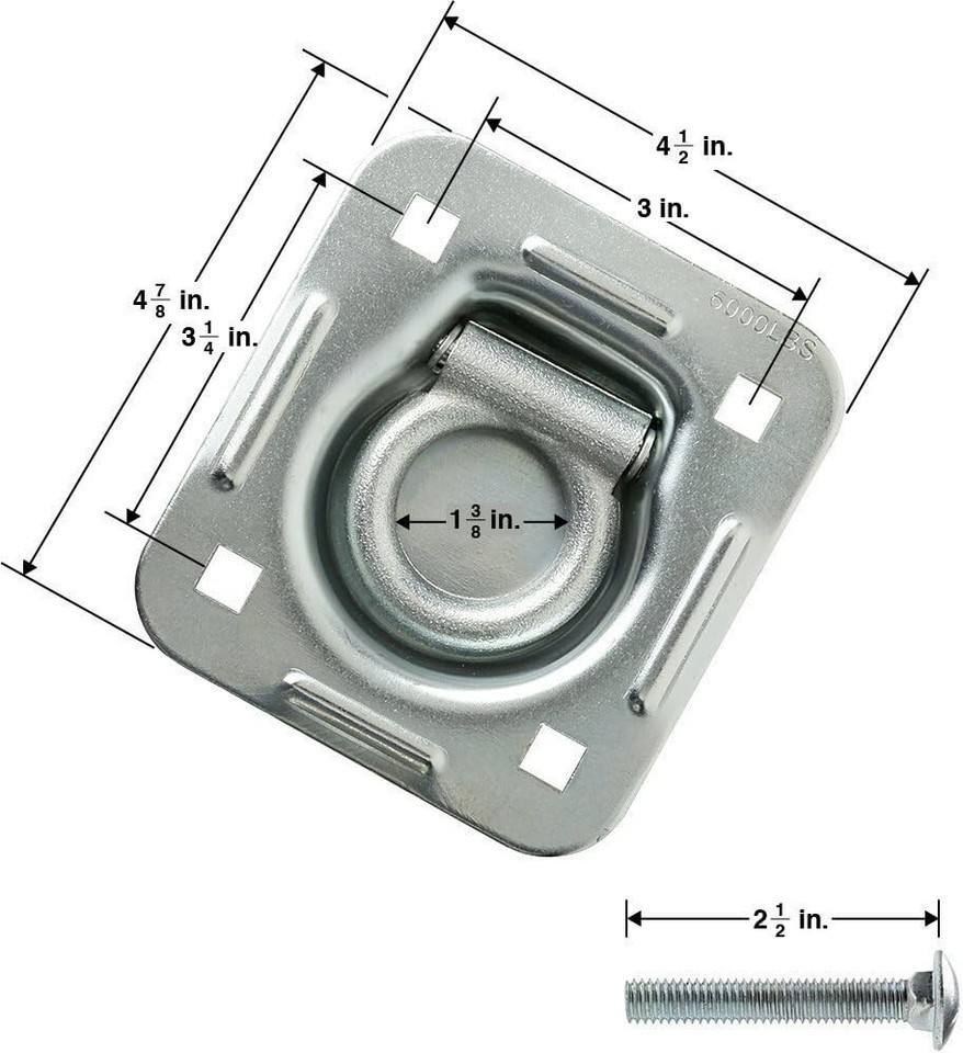SPECIFICATIONS of d-ring: 1) The base measures 5" x 4-1/2". 2) Hole pattern is 3" x 3-1/2" on centers. Recessed dimension is 3" diameter with a flat edge. 3) The 7/16" diameter ring measures 1-3/4 center. 4) The ring pivots on a 5/16" threaded stud. 5) The pan has a 1/4" drainage hole. HARDWARE: This listing comes with two (2) hardware kits, enough to finish the installation. Each kit comes with 4 - 3/8" x 2-1/2" long carriage bolts, 4 - fender washers, and 4 - 3/8" superior NYLON LOCKING NUTS.