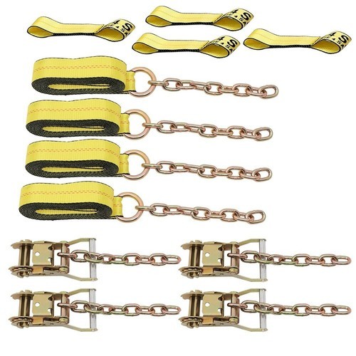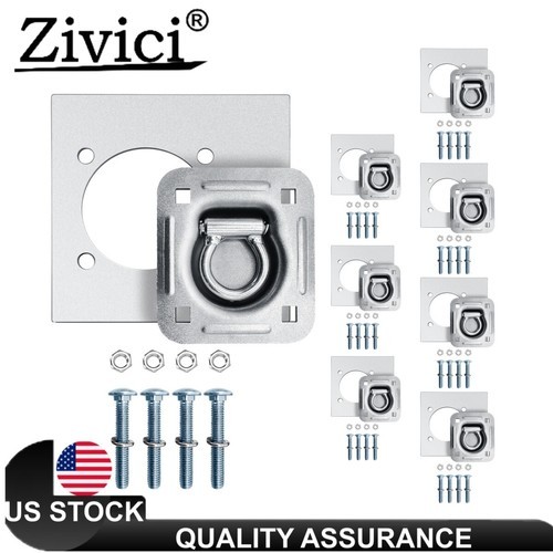 4 complete sets of D-rings, backing plates and 2 1/2" hardware kits. Installation instructions included. Both components are zinc coated to inhibit rust and corrosion. The d-rings have square holes punched for receiving carriage bolts, providing a smooth and relatively trip free surface. When in use the ring portion raises for application and lies down when not in use, thus creating a flush surface. It is plenty strong and is able to receive multiple tie-down straps simultaneously.