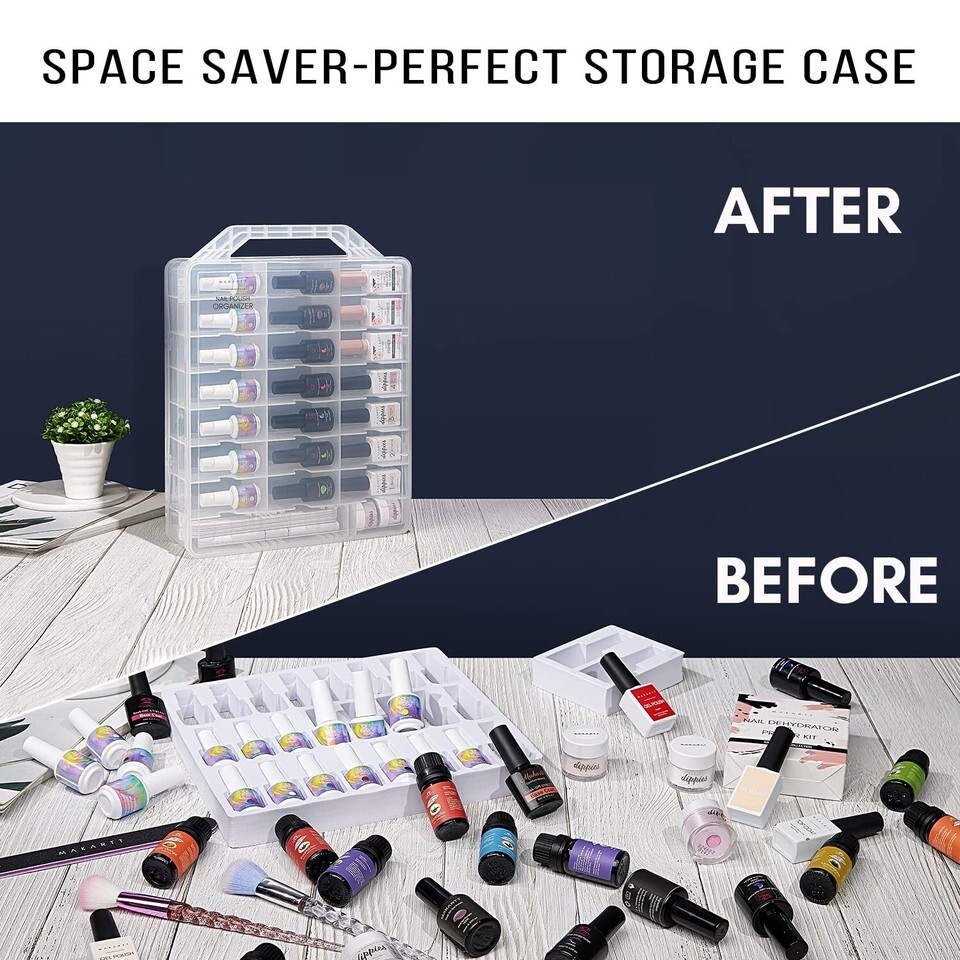 Save Space - The nail polish organizer box can store 48 pieces nail polishes visibly accessible and orderly. Compact figure can be placed on your counter top or dresser horizontally or uprightly, save much space. Please note the nail polishes are not available with the box. a great add-ons nail tech supplies