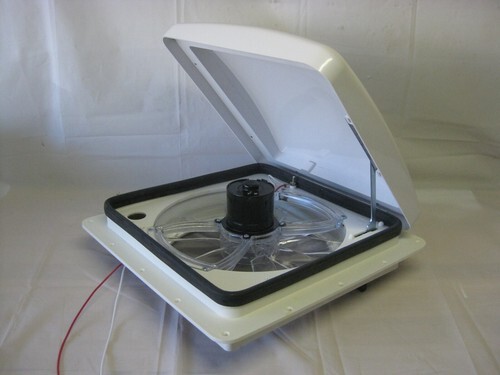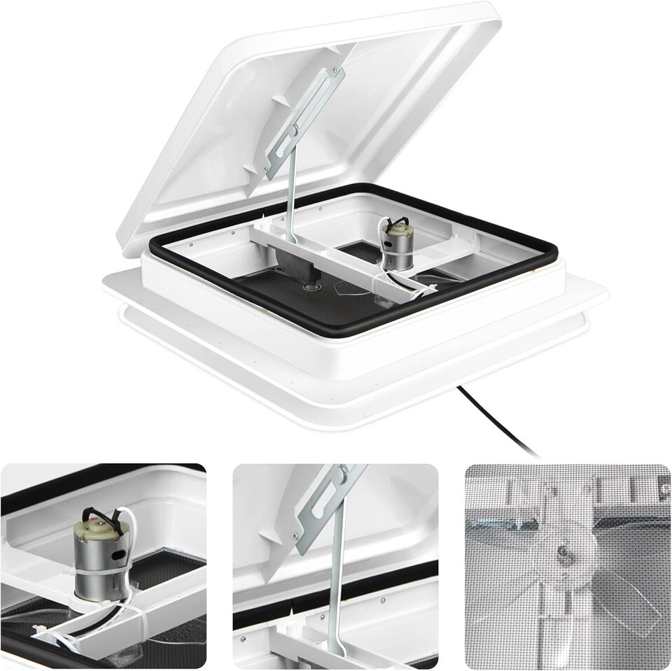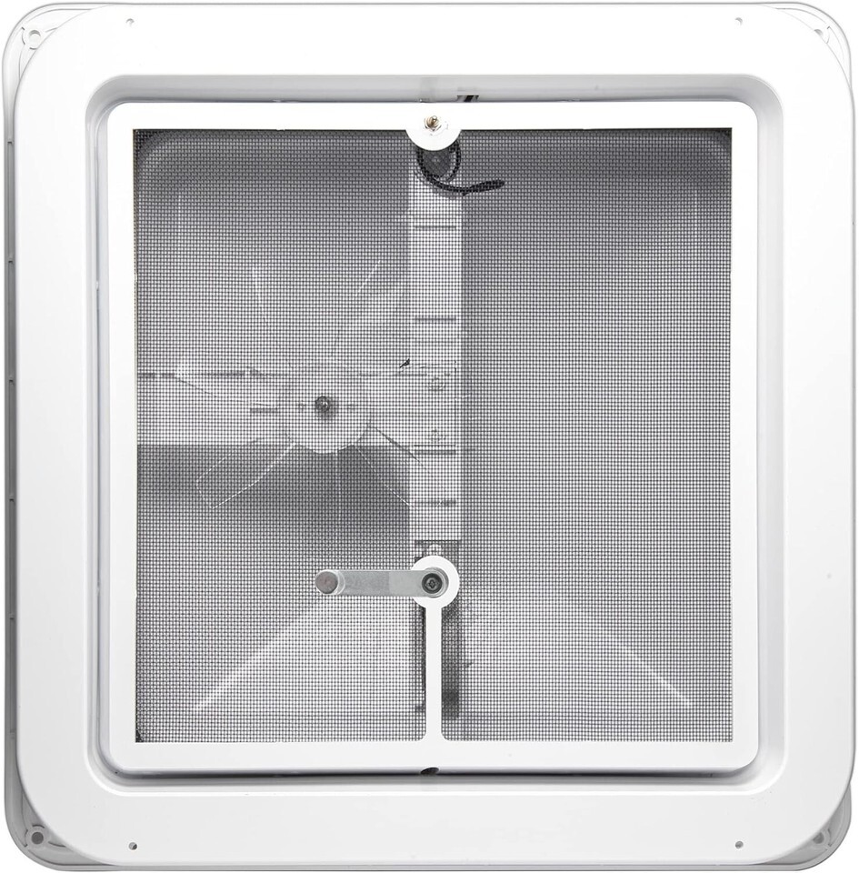 Roof vent with reversible 12V fan pushes stale air out of and pulls fresh air into your RV, camper, or enclosed trailer.