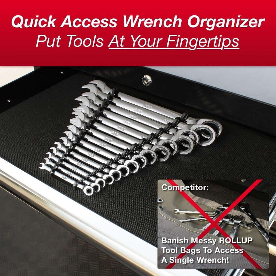 Quick access wrench organizer: Avoid messy rollup bags just to get 1 wrench out! Not to mention the painstaking time it takes to organize, and perfectly roll up. Our wrench organizer almost magically cuts this time down to seconds.