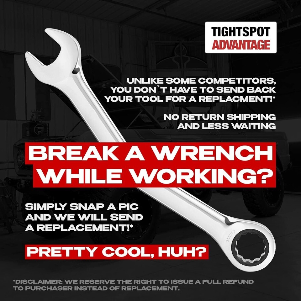Our ultimate TightSpot wrench to work faster in small spaces: Our incredibly priced, 4 degree ratcheting movement is designed to access spots where standard wrenches will not have enough swing. The 90 teeth inside the 100% steel ratcheting box end will speeds you through jobs quickly with no need to lift. And without lifting, you stay glued to the fastener until the turning is done, even if you're reaching deep into a compartment or appliance.