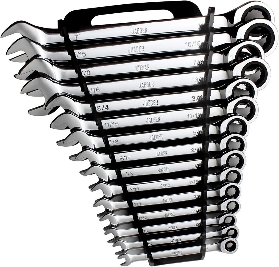 15pc 90-Tooth Ratcheting Wrenches MASTER SET - Our LARGEST SAE With Wrench Rack Organizer - Our standard in safety for combination wrench sets from gear to tip
