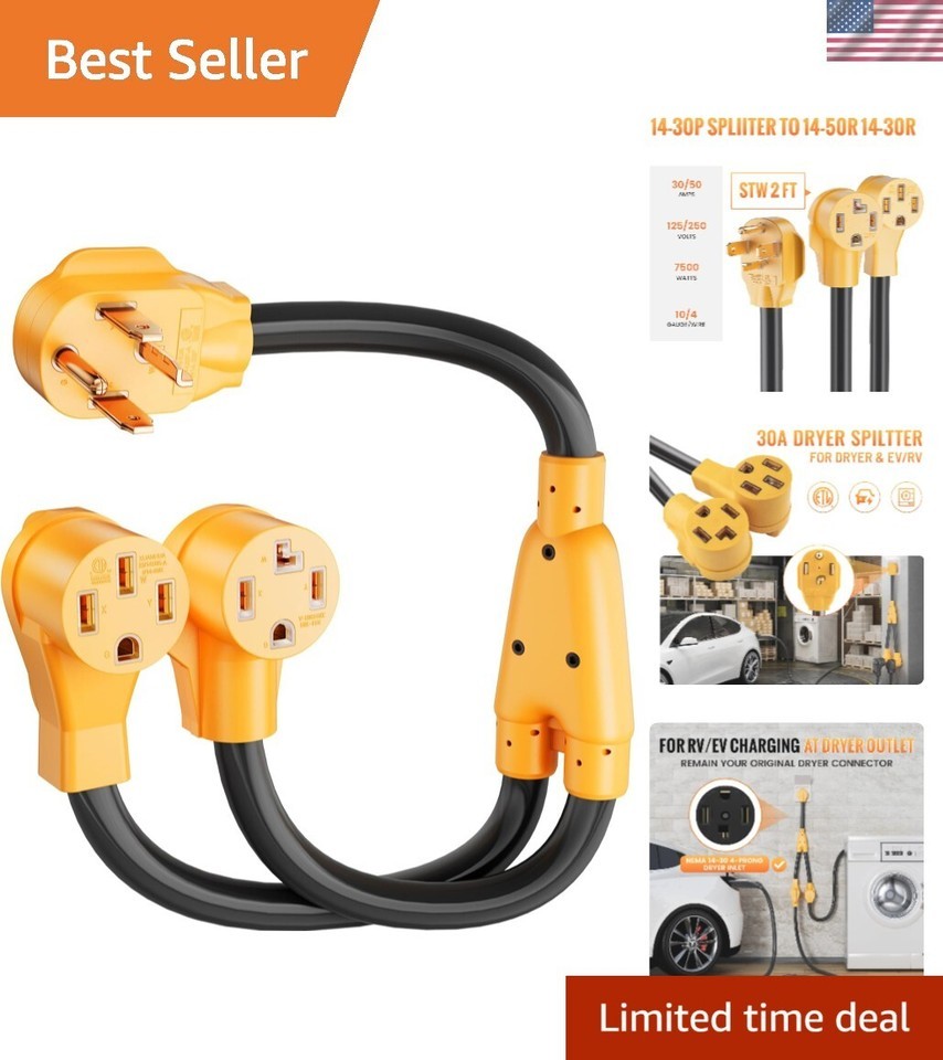 14-30P to 14-30R/14-50R Adapter: - This 30amp dryer to EV charger adapter Y splitter features a 4-prong NEMA 14-30P male plug to a combo 14-30R and 14-50R female outlets; Power Support: maximum 30 Amp overload (125/250V | 7500Watts)