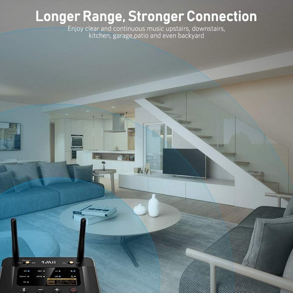?Extend Long Range?Utilizing Class 1 Bluetooth technology and designed with dual antennas, B03Pro Bluetooth transmitter receiver can achieve a range of up to 265ft (80m) line-of-sight in open air and up to 80-110ft (25-35m) indoors. *NOTE: Operation range can be affected by Wi-Fi routers, Wireless TV adapters, physical obstructions like walls, metal obstacles etc. and also depended on receiving device.