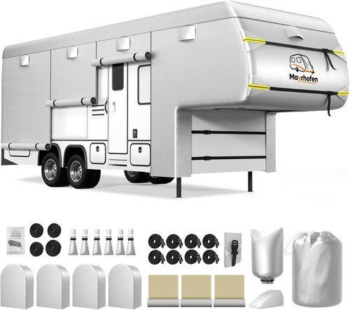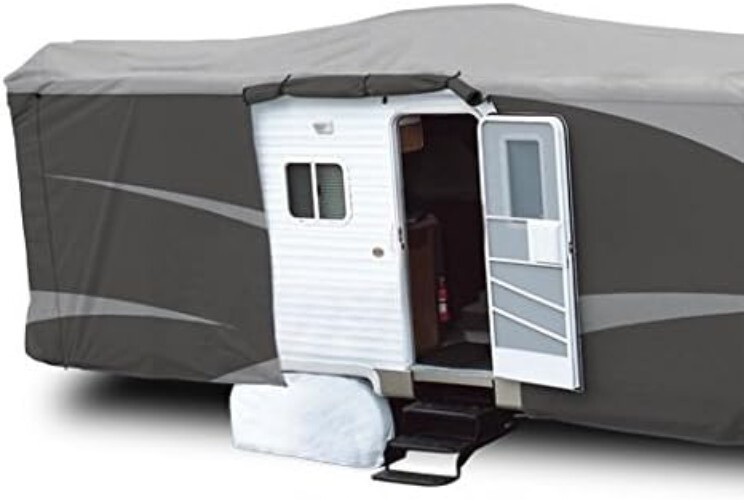 Protect your Travel Trailer with 's Designer Series SFS AquaShed RV Cover. Designed for moderate climates with high moisture. Features triple layer SFS AquaShed top panel and triple layer designer polypropylene sides with a contemporary aesthetic unique to . Significantly reduces premature aging of RV and helps maintain resale value. Keeps Roof clean to reduce black-streaks from forming the sides of the RV. Reduces need for washing, waxing and roof treatments. Protection against harmful UV rays that can cause unwanted cracking and fading on your RV. Multiple Passenger-side zipper entry doors for easy covered access. Reinforcements throughout cover significantly reduce snags tears. Reinforced Buckles, Flaps, and Straps resist rip-out. Built-in Vents allow air to escape the cover in moderate winds. Roof fabric partially extends down the front, back and sides of the cover for extra protection. Front, rear and bottom buckle cinching system removes slack and prevents billowing. Color is Gray on Top with Gray Sides. Features . Includes: Rain gutter spouts protectors to prevent cover puncture (We highly recommend using these travel trailers in particular). Storage bag. Ladder Cap to prevent contact with cover. Extra adhesive reinforcement material. Weighted buckle toss-under for easy installation. Why SFS AquaShed? Multilayer composition includes a microporous film that repels water, but allows air to penetrate. Soft to the touchy, yet durable. Moderate, UV stability (For High UV climates, we recommend our Designer Series Tyvek products). This fabric is a great value for its price point. How to Buy the Best fitting cover for your travel trailer? Measure from the longest two points, including bumpers and ladder but excluding hitch to determine proper size needed. It has been highly recommended for moderate climates and short term storage.