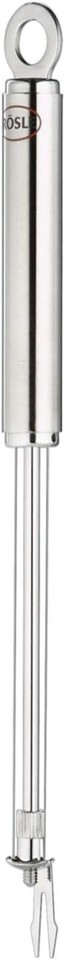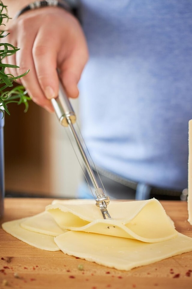Durable Product .com One of 's superb kitchen tools, this cheese slicer has two replaceable wires set at different distances from the center post, permitting 4-1/4-inch-wide slices of different thickness. Prongs on the end allow users to pick up and serve slices. Like all tools, utensils, and Open Kitchen storage components, this cheese slicer is made of 18/10 stainless steel for rustproof beauty and long-lasting durability. The round handle has a satin finish to conceal finger marks. The handle is sealed against water and has a hanging ring so the cheese slicer can be conveniently stored on a hook in the Open Kitchen system of basic rails and Gridwalls or hung on any hook or peg. The cheese slicer is sturdy, balanced, and exceptionally comfortable in the hand. All products are dishwasher-safe, and carry a against defects. --Fred Brack