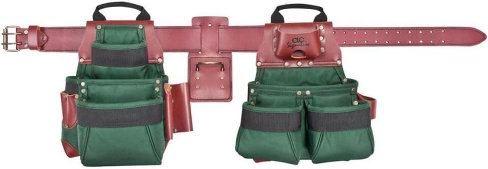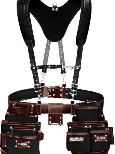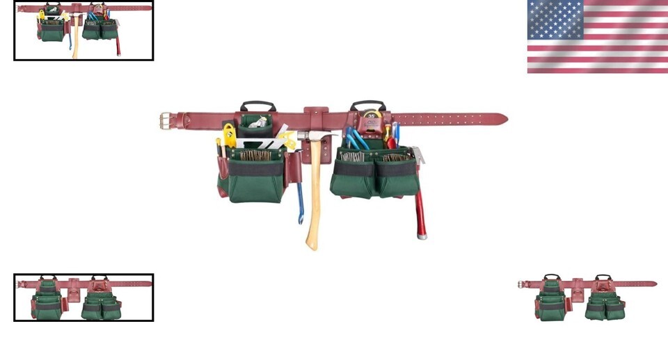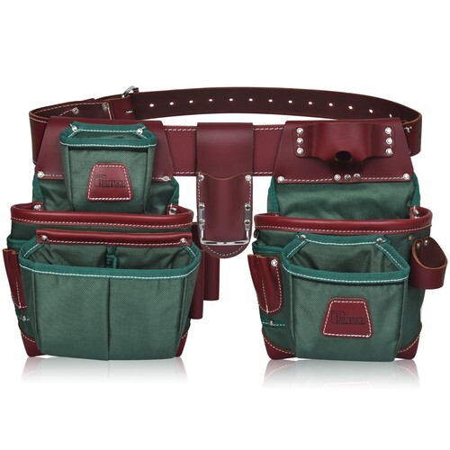 Features: Adjustable,Made in the USA,Easy adjustments,Patented easy handle design,Easy storage,Ideal for carrying apron,Gusset front pockets,Durable tool apron,Heavy duty top grain leather,Double tongue steel roller buckle,17 pocket tool apron,8 smaller pockets for tools,Leather combination square holder,Leather pry bar holder,Fits waist sizes 29" - 42"